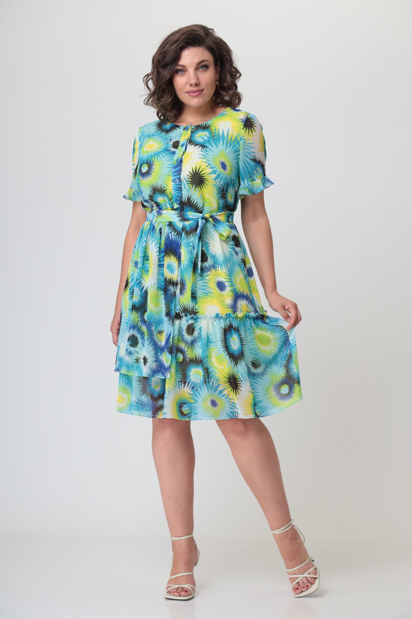 Платье женское А-образного силуэта (расширенное к низу). Расширение по низу достигается за счёт волана. Платье выполнено из шифона на трикотажной подкладке. Платье втачного покроя, рукава короткие одношовные, низ оформлен воланом со сборкой. Спинка цельная с надстрочным воланом с оборкой по верхнему срезу волана. Перед ассиметричный: левая часть цельная, правая с подрезной линией от центра до бокового шва, по талии подрезной шов оформлен воланом со сборкой. В верхней части переда расположена декоративная планка. На переде расположены декоративные вытачки, идущие из боковых швов. Дополнением к платью служит пояс из основной ткани.