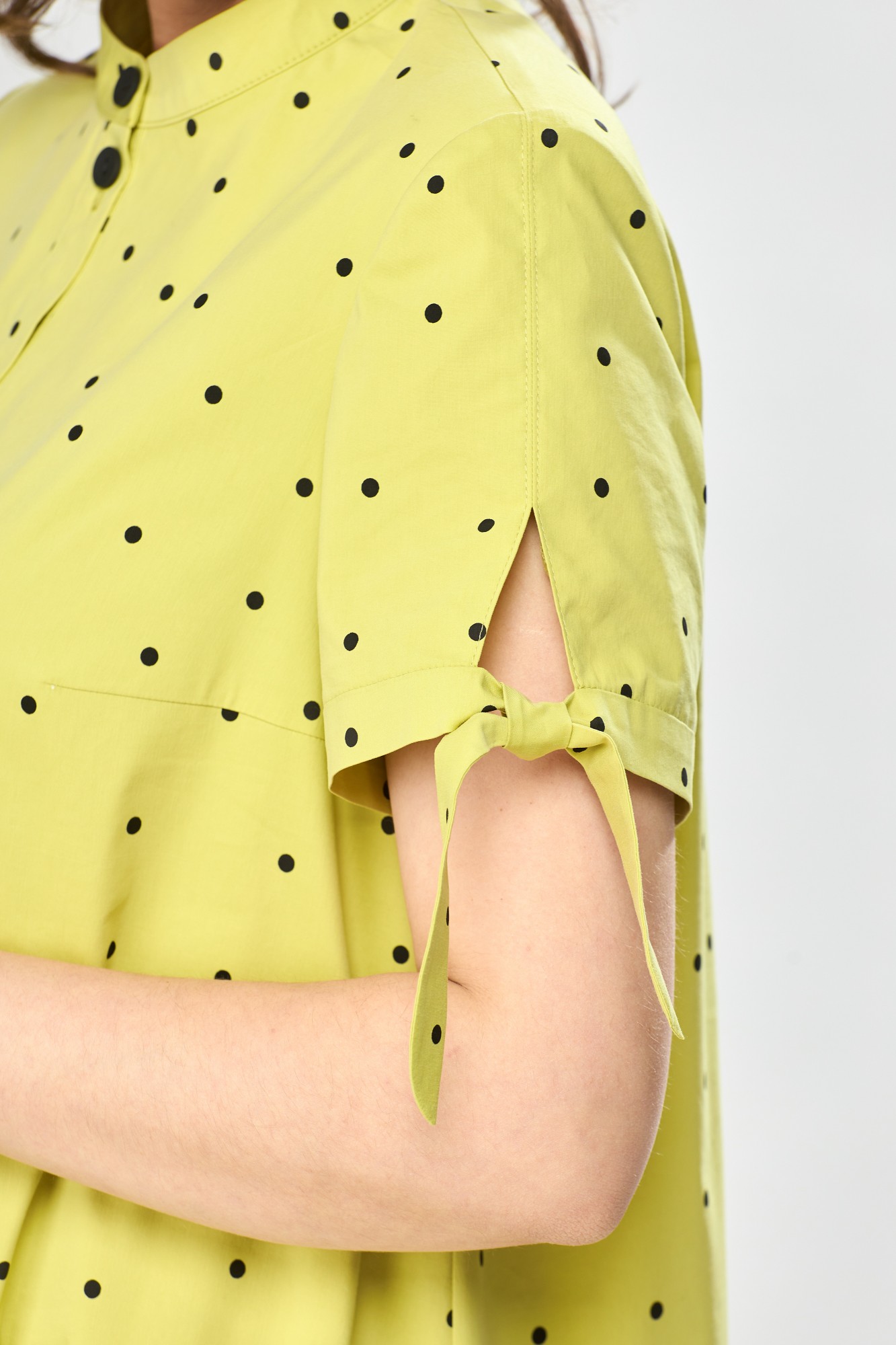 Платье для повседневной носки. Платье женское расширенное к низу, длиной за колено. Перед с 2-мя нагрудными вытачками с фигурным подрезом о линии талии до линии бёдер, в швах соединения подрезов обработаны карманы, собранные на эластичную тесьму. Перед с 2-мя приточными вертикальными планками по центру. Спинка с горизонтальным подрезом на уровне линии бёдер, верхний срез нижней части подреза со сборкой. Горловина круглая с втачной стойкой. Застёжка центральная на 5-тьобмётанных петель и 5-тьприштыных пуговиц. Рукав втачной, 2-х шовный, короткий. Верхний шов рукава с разрезом, низ с приточной манжетой, переходящей в завязки. Платье с плечевыми накладками.