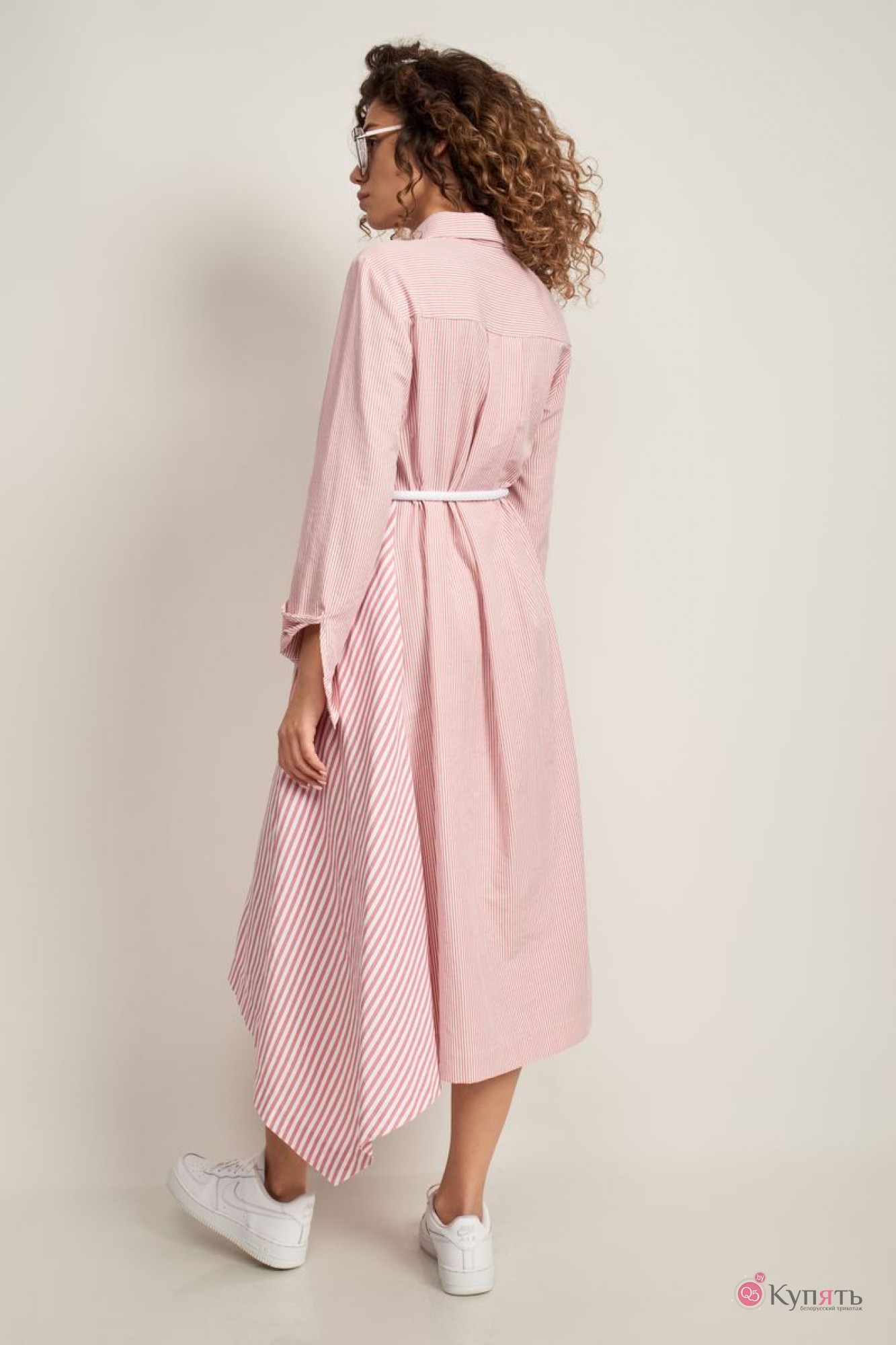 Платье-рубашка свободного силуэта. Центральная застежка потайная на пуговицах. В боковых швах карманы. Платье ассиметричное- одна из полочек выполнена углом. Рукав длинный с манжетом. Воротник рубашечный. Завязывается на декоративный пояс- шнур.
