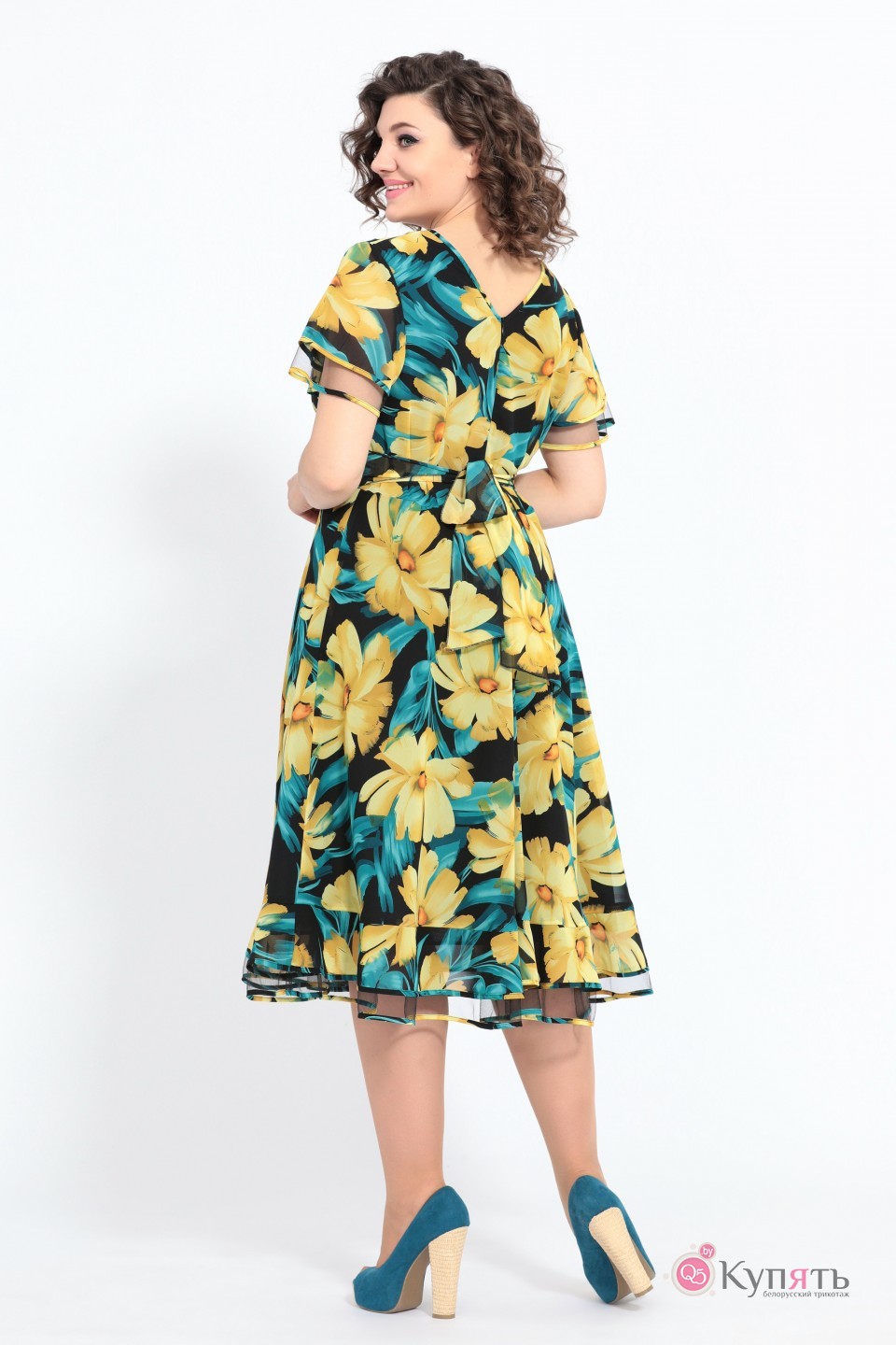 Нарядное женское платье из шифоновой ткани. Отрезное по линии талии. По полочке, по линии идет фигурная кокета переходящая в пояс,которая регулирует ширину талии и завязывается сзади. Низ изделия юбки полу солнце-клеш. По низу юбки пришит волан, состоящий из шифоновой ткани с фатином. Волан обработан бейкой в цвет изделия. Платье на хлопковой подкладке. Рукав короткий, по низу которого так же пришит волан состоящий из шифоновой ткани и фатина. Вырез горловины треугольный, глубину выреза можно регулировать пришивной кнопкой.По центру спинки потайная молния. Длина рукава в 48р-21см, длина изделия в 48р-102см+ еще волан 3см.