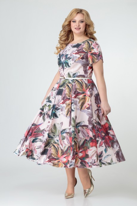 Платье из тонкого текстиля прилегающего силуэта, отрезное по линии талии. По переду и спинке лифа расположены рельефы. Юбка расклешенная из шести клиньев со встречными складками по линии талии. В среднем шве спинки предусмотрена молния. Рукав втачной покроя тюльпан, длина рукава 15 см (+ - 1 см) (в размере 54-64) и 33 см (+ - 1 см) (в размере 66-70). Длина изделия по спинке 120 см (+ - 1 см) ( в размере 54-64) и 123 см(+ - 1см) ( в размере 66-70).
