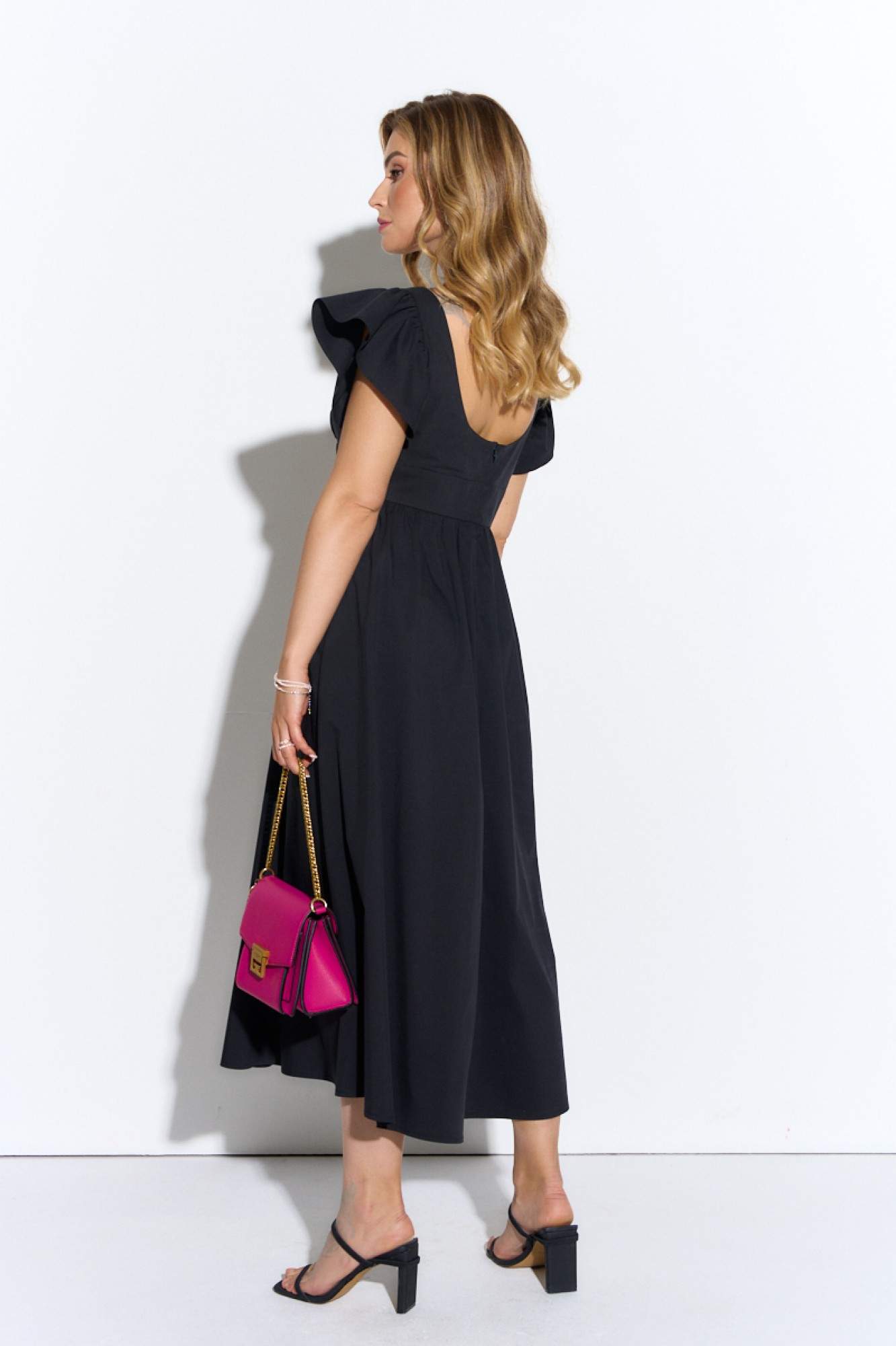 Платье с завышенной линией талии и пышной юбкой. Спереди v-образный вырез и углубленный по спинке. Рукава крылышки со сборкой. Сзади застежка на потайную молнию. Карманы в боковых швах.