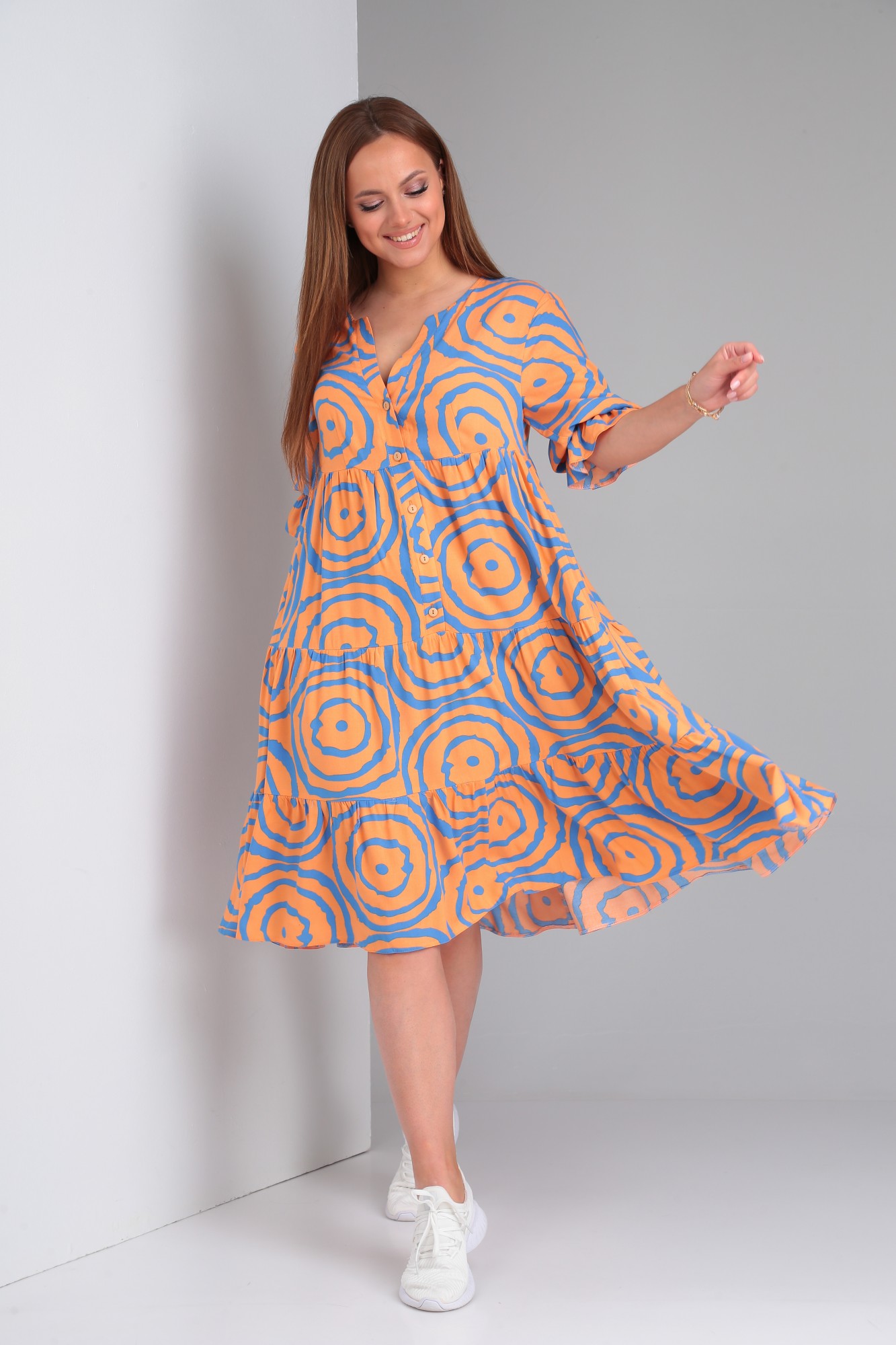 Платье женское свободного покроя из легкой плательной ткани с принтом. По переду лифа и верхнего волана центральная застёжка в виде отрезной планки. Рукав втачной 3/4, присобран резинкой по низу.