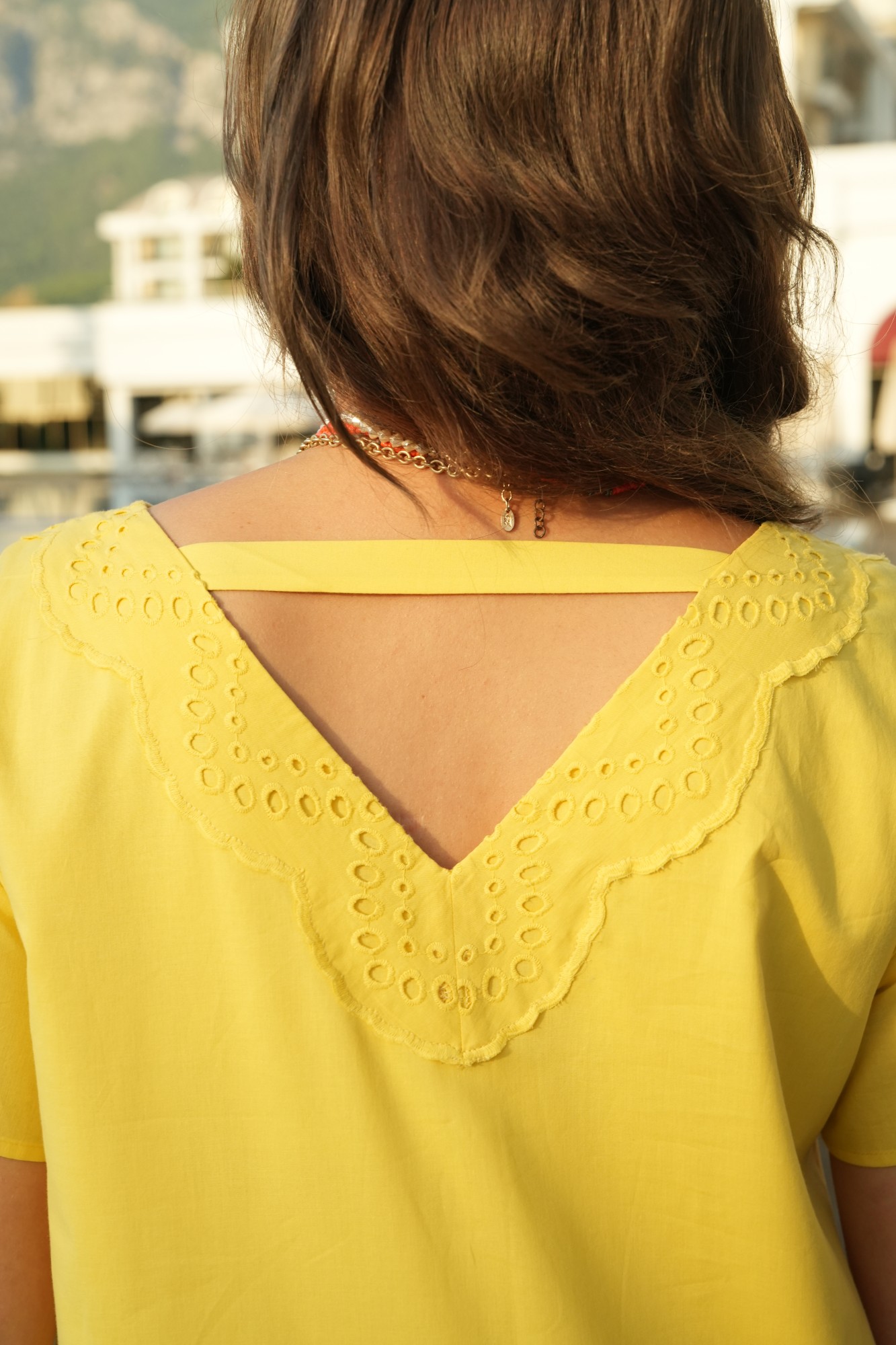 Просто находка для лета! Легкое, приятное к телу, из натурального хлопка, который подарит вам легкость и комфорт, даже в жаркие летние дни. Красивое ришелье в фигурных подрезах смотрится дорого и нарядно. Данная модель подойдёт как для повседневной носки, так и для торжественных мероприятий. Платье А-образного силуэта с горловиной V-образной формы, оформлен фестонами с ришелье, и нагрудными вытачками по переду платья. Вырез горловины спинки V-образной формы, оформлен фестонами с ришелье и планкой из однотона. Рукав втачной, короткий. В фигурных подрезах по переду и спинки платья вставки воланов со сборкой от подрезов. Низ в платье ровный.