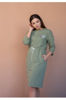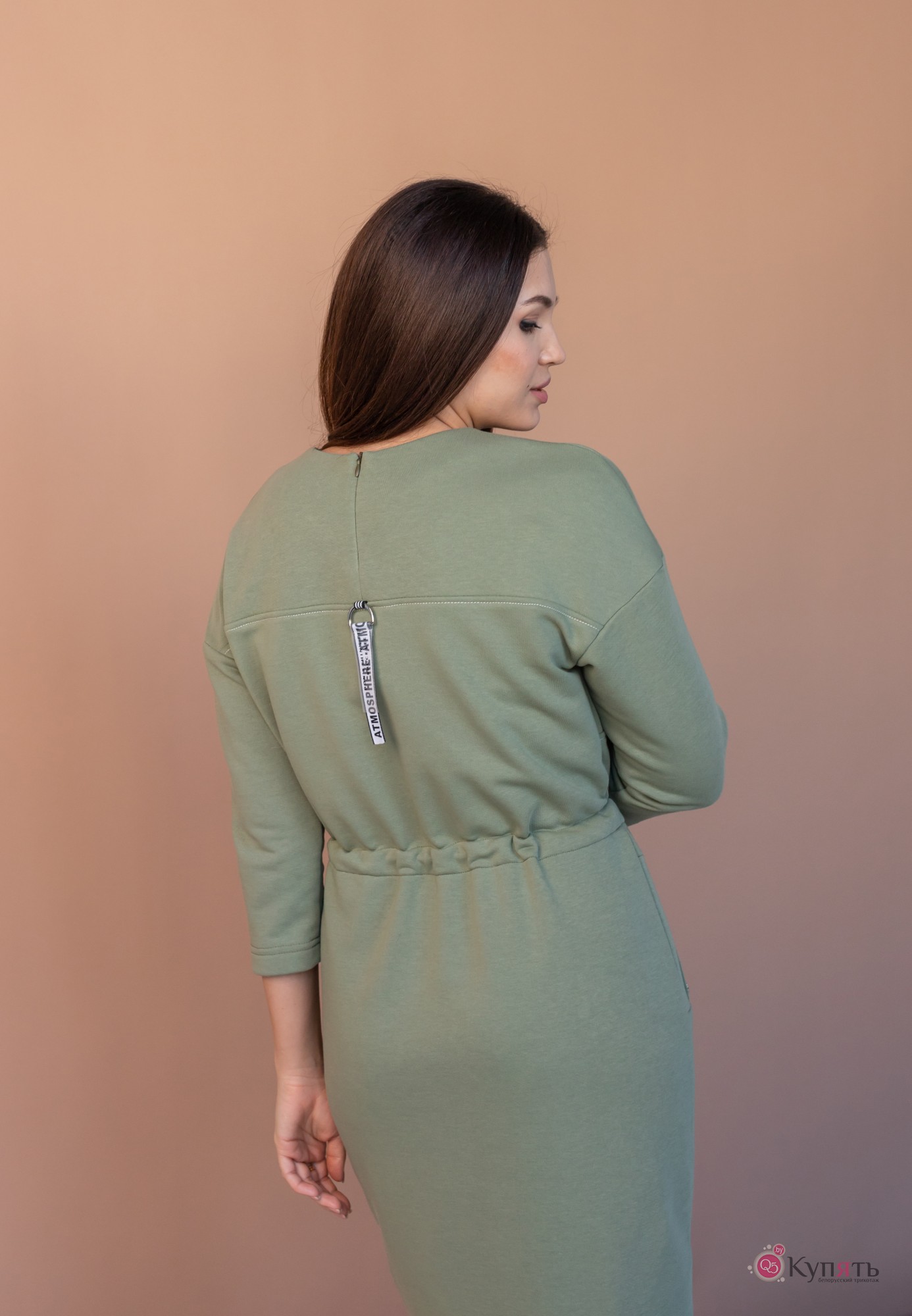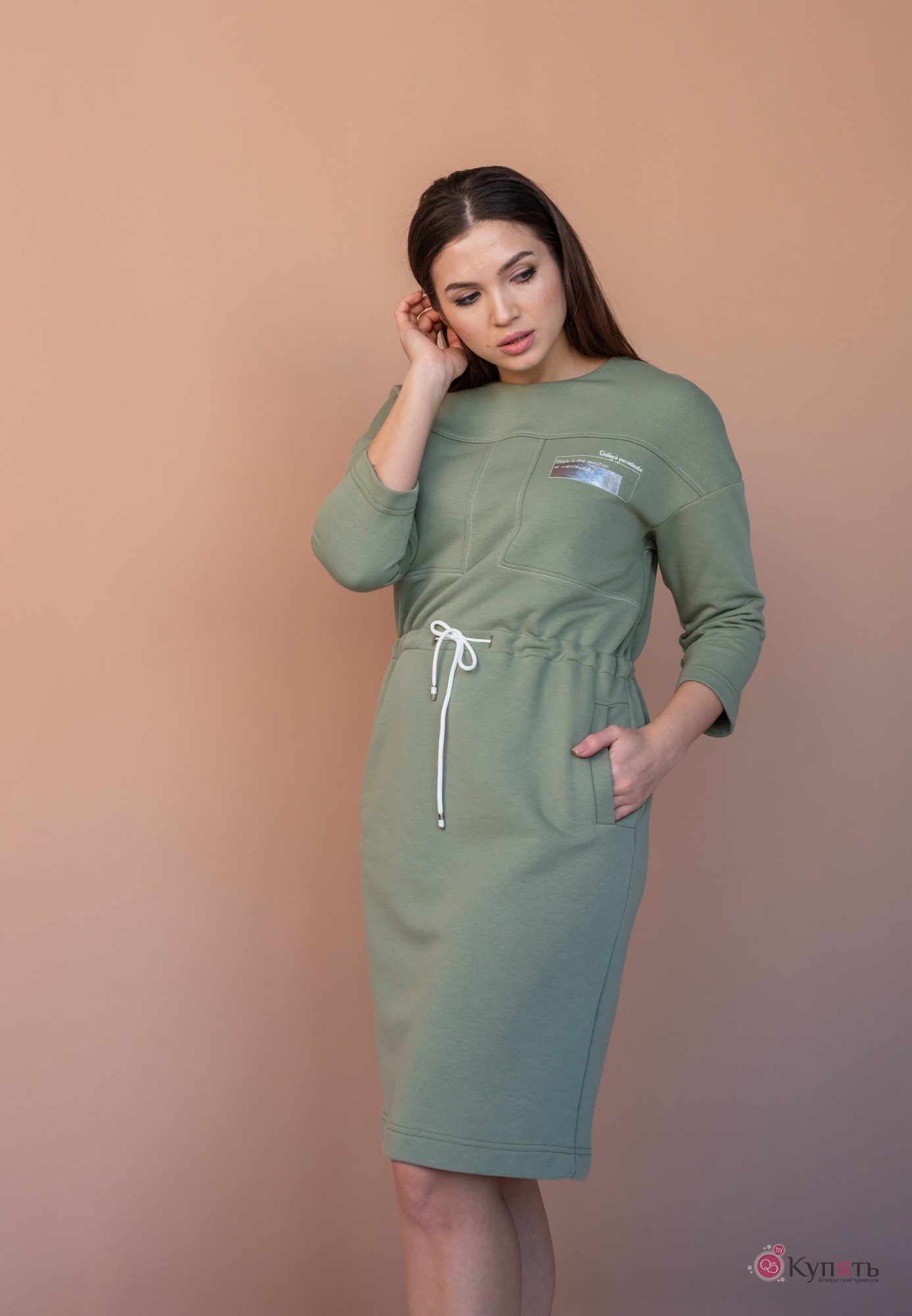 Платье женское свободного силуэта, со спущенными рукавами, выполнено из трикотажного полотна. По переду кокетка, фигурные подрезы и прорезные карманы с листочкой. Застёжка, потайная тесьма молния, находится в центральном шве кокетки спинки. По линии талии кулиса с продетым в неё шнуром. Горловина круглая. Платье без подкладки. Украшает изделие контрастные отделочные строчки и декоративная печать.