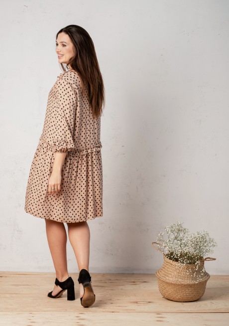 Платье женское свободного силуэта отрезное ниже линии талии, выполнено из плательной ткани. Перёд платья с фигурными кокетками и центральным швом. Спинка со средним швом и застёжкой на потайную молнию. Горловина V-образная. Рукава одно шовные втачные со сборкой по низу. Платье без подкладки. Украшением платья служат рюши и декоративные пуговицы.
