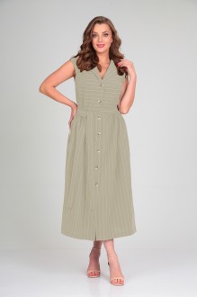 Платье женское из текстильной ткани в полоску. Платье отрезное по линии талии на резинке, со сьемным поясом в тон платья. На полочке лифа-нагрудные вытачки с бокового шва. Юбка платья со сборкой, по бокам карманы с фигурным входом и клапаном. Клапаны закреплены пуговицами. Воротник английского типа, с лацканами, рукав- крылышко. По талии, в области боковых швов настрочены шлевки.