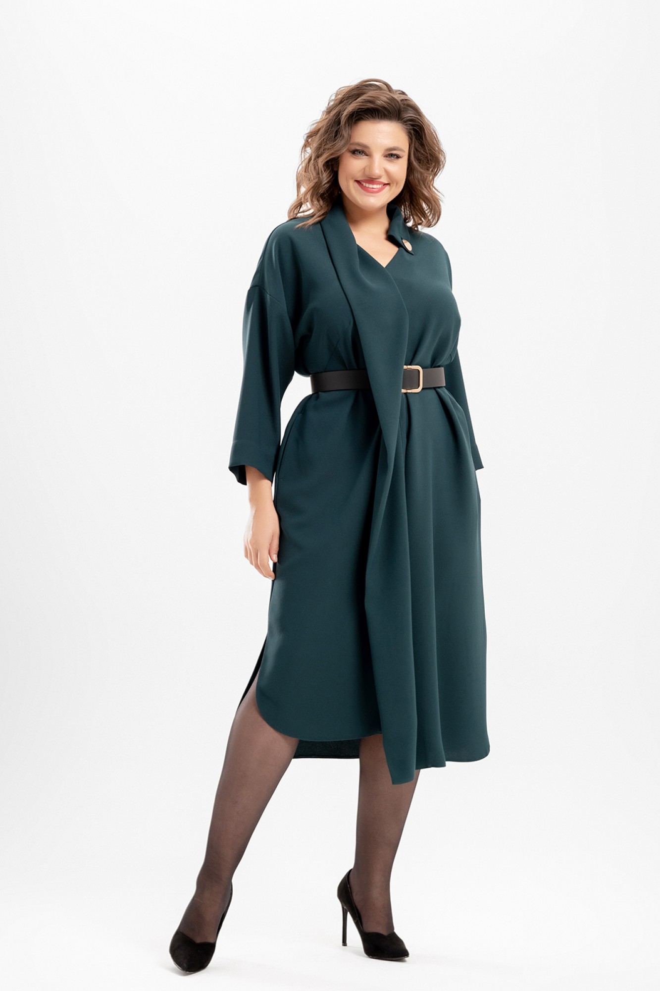 Платье женское свободного силуэта с карманами в боковых швах и асимметричным низом. Вырез горловины оформлен отложным воротником переходящим в декоративную планку.Рукава отрезные на базе цельнокраеных. В боковых швах- разрезы. Длина спинки-120 см. Длина рукава от линии горловины- 63 см. Изделие дополнено съемным поясом. Отделочная фурнитура может меняться.