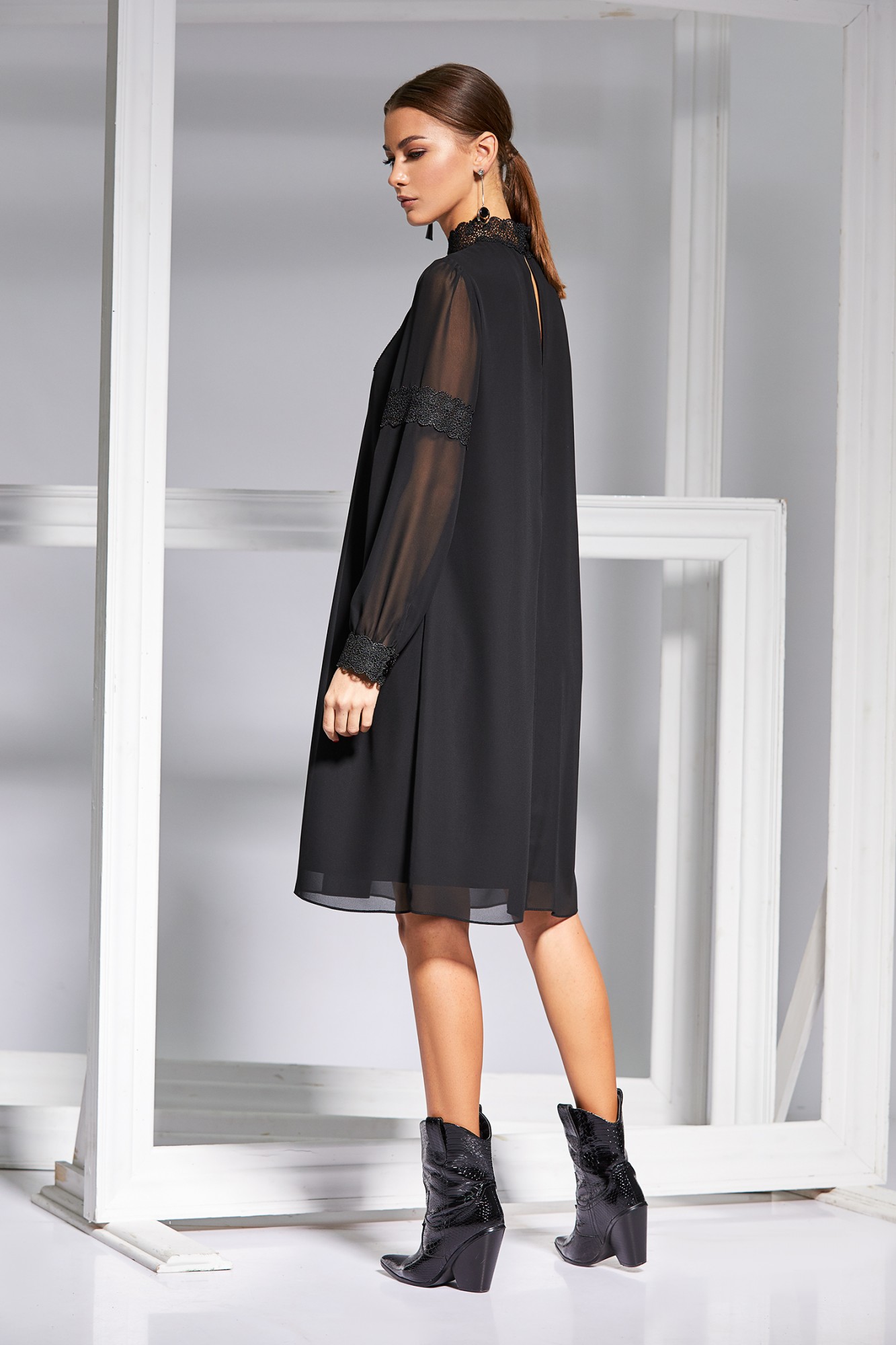 Платье А-силуэта с воротником стойкой. Платье двухслойное, нижний слой из ткани-компаньона. По переду платья декоративные складки и кружево. Рукав втачной длинный , декорирован кружевом, по низу обработан притачным манжетом с кружевом с застежкой на пуговицы. Спинка со средним швом с застежкой на пуговицы.