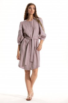Платье без воротника, с круглым вырезом горловины, застежкой на потайную молнию в среднем шве спинки. Платье отрезное по линии талии. Верхняя часть переда с талиевыми вытачками. Спинка со средним швом, верхняя часть спинки с талиевыми вытачками. Окат рукава присборен. Платье со съемным поясом. Вид покроя рукава: втачной, длинный, с отрезной манжетой. Комплектация: платье на подкладке