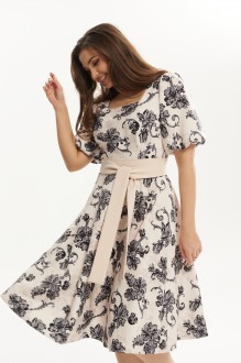 Платье женское полуприлегающего силуэта отрезное по линии талии. Лиф переда с нагрудными и талевыми вытачками. По спинке рельефы от проймы до талии. Горловина фигурная. По среднему шву спинки сверху застёжка потайная молния. Юбка расклешённая. Рукав одно шовный втачной. Низ и окат рукава со сборками. Изделие дополняет пояс кушак. Платье без подкладки.