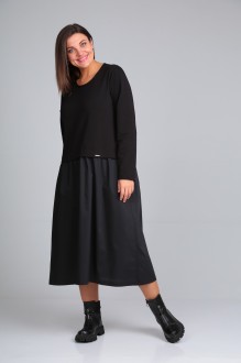 Женское платье полуприлегающего в области талии силуэта и расширенное к низу. Платье выполнено на сочетании материалов: однотонной ткани костюмно-плательного ассортимента и шифона. Из однотона выполнены рукава, лиф платья и баска, таким образом создается имитация жакета и юбки. Вырез горловины округлый, декорирован съемным шарфом. Шарф выполнен из шифона и продевается сквозь широкую пату возле горловины. Юбка также выполнена из шифона, есть нижняя юбка из подкладочной ткани. Рукав втачной с разрезом по низу. Спинка со средним швом, в котором расположена застежка на потайную тесьму-молнию. Дополнительным декором служат пришитые на баске в два ряда пуговицы и съемная брошь. Длина рукава 44 см. Длина платья по спинке 113 см.