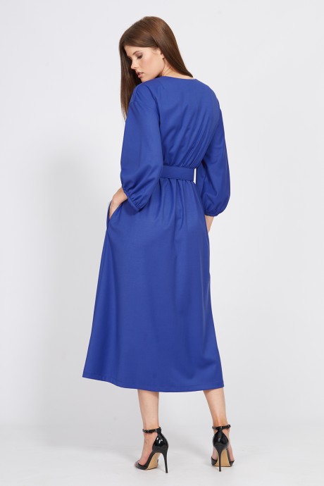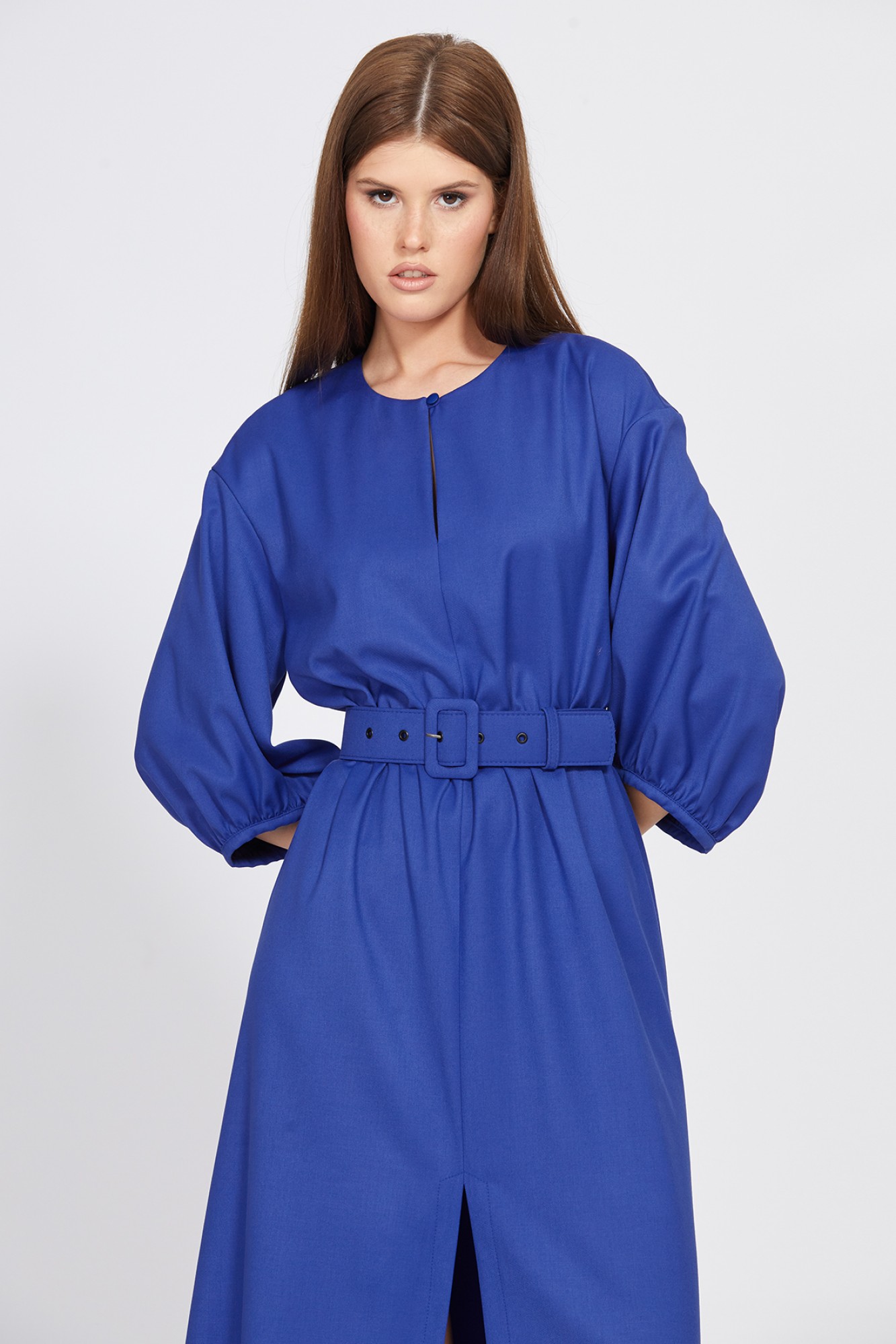 Платье выполнено из однотонной плательной ткани. Платье Х-образного силуэта, отрезно по линии талии, длиной миди. Перед со средним швом, в котором обработан разрез, застегивающийся на пуговицу. Спинка цельная. Горловина округлой формы. Плечевой шов спущен. Рукав одношовный, длиной 3/4, со сборкой по низу. Низ рукава обработан бейкой. Юбка расширена к низу. Перед юбки с разрезом в среднем шве. В боковых швах карманы. В комплект входит съемный ремень с обтяжной пряжкой.