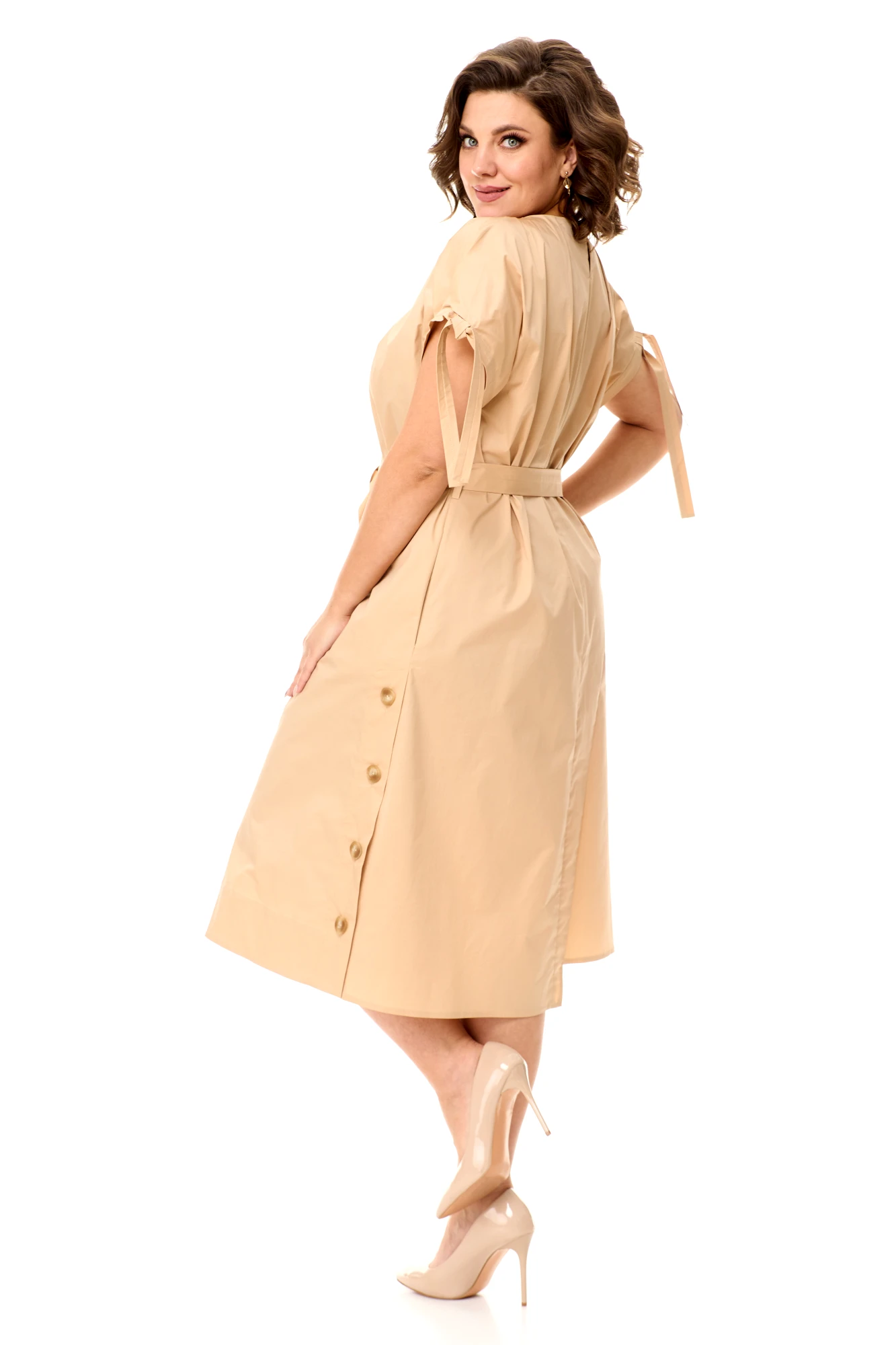 Изящные акценты: Вырез-лодочка, короткие рукава с завязками и аккуратная застежка-капелька на спинке создают утонченный и завершенный образ.