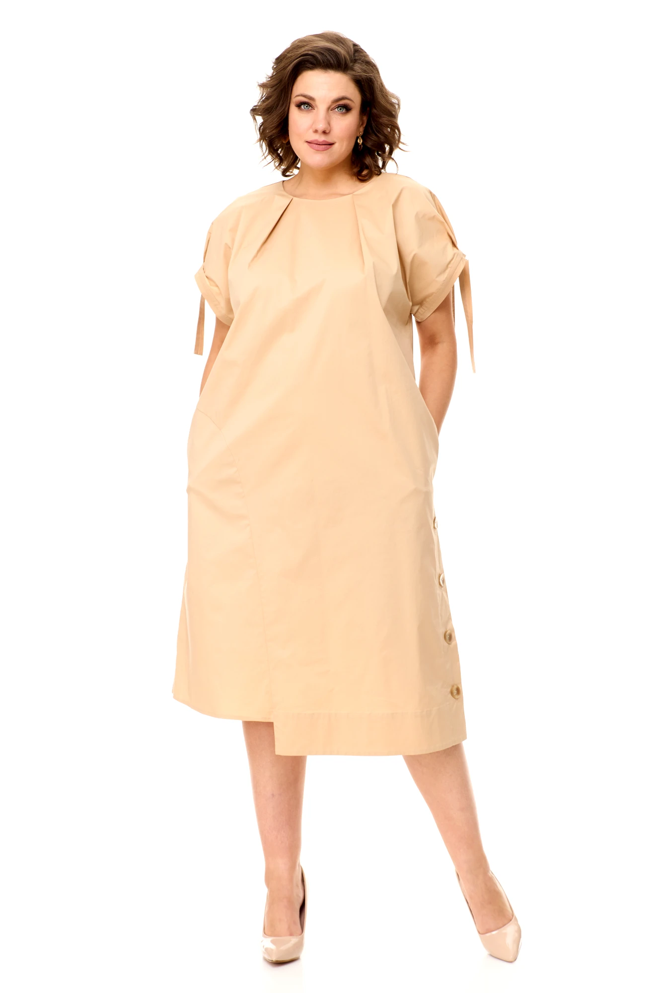Платье женское хлопковое оверсайз мод. 1026, миди, с поясом и разрезом. Пудровое нарядно-повседневное больших размеров