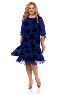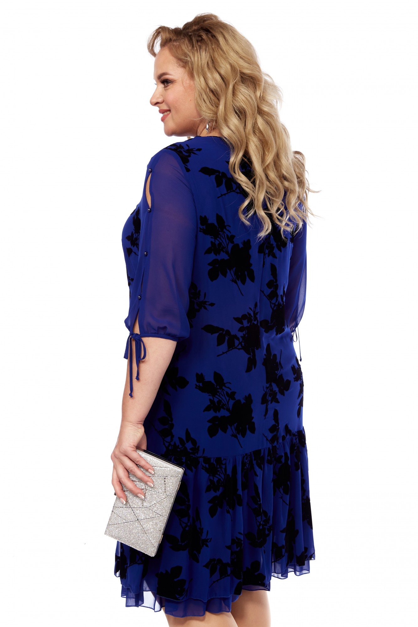Нарядное женское платье свободного силуэта из легкого шифона с нанесением декоративных элементов из флока, с легкой трикотажной подкладкой в цвет основной ткани по всей длине платья. По низу платья и подкладки – отрезные воланы, декорированные небольшой оборкой. Вырез горловины округлый. По переду нагрудные вытачки. По спинке застежка на потайную «тесьму-молнию».