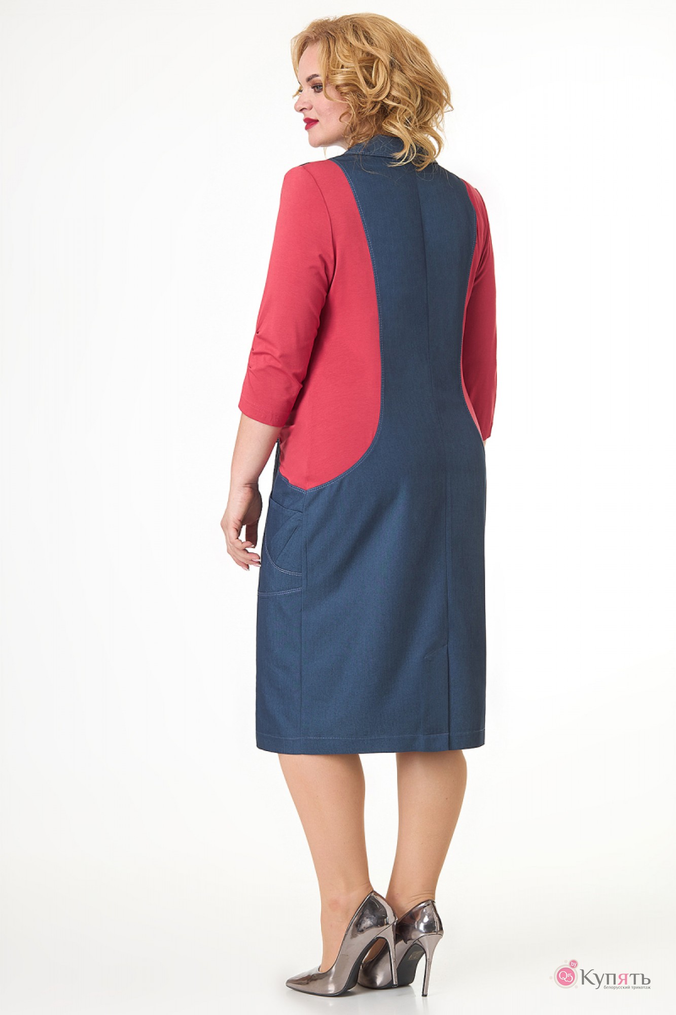 Оригинальное платье полуприлегающего силуэта из двух видов ткани отлично подойдет как в офис, так и на выход. Платье полуприлегающего силуэта длиной чуть ниже колена. Перед очень красиво разбит на детали и представляет собой имитацию сарафана с нежным отложным воротничком пиджачного типа. По кокеткам отстрочены защипы, по центральной детали - сборка. Чуть ниже талии - декоративный втачной ремень, а также платье с имитацией застежки на 3 металлические пуговки. По переду обработаны удобные и функциональные карманы. Спинка со средним швом и бочками закругленной формы. Рукава втачные, длиной ¾, одношовные. По рукаву внизу заложены 3 небольшие складочки.