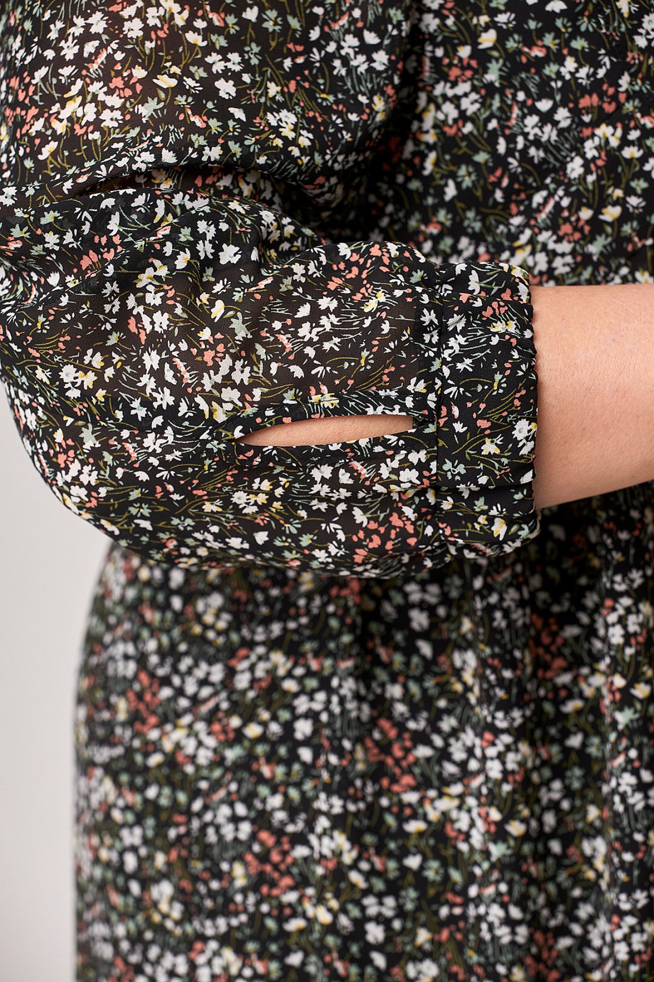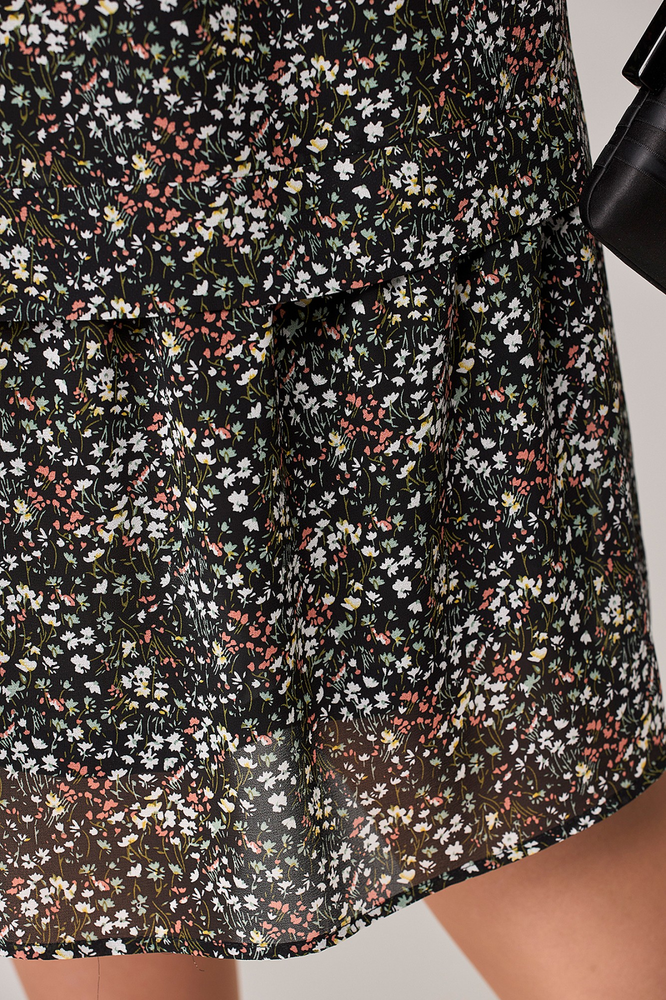 Элегантное платье из шифоновой ткани с цветочным принтом идеально подойдет для создания нежного образа романтичной кокетки. Горловина овальной формы с фигурным вырезом. Асимметричный перед с отлетными планками в швах и аккуратной, струящейся драпировкой. Накладной карманчик с изящной пуговкой, несомненно, будет нужным дополнением. Спинка со средним швом. Игра длин платья и подкладки наполняют образ воздушной многослойностью. Рукав втачной, двухшовный, низ рукава с притачной манжетой, собран на эластичную тесьму. Нарядное платье, в котором Вы будете выглядеть женственно.