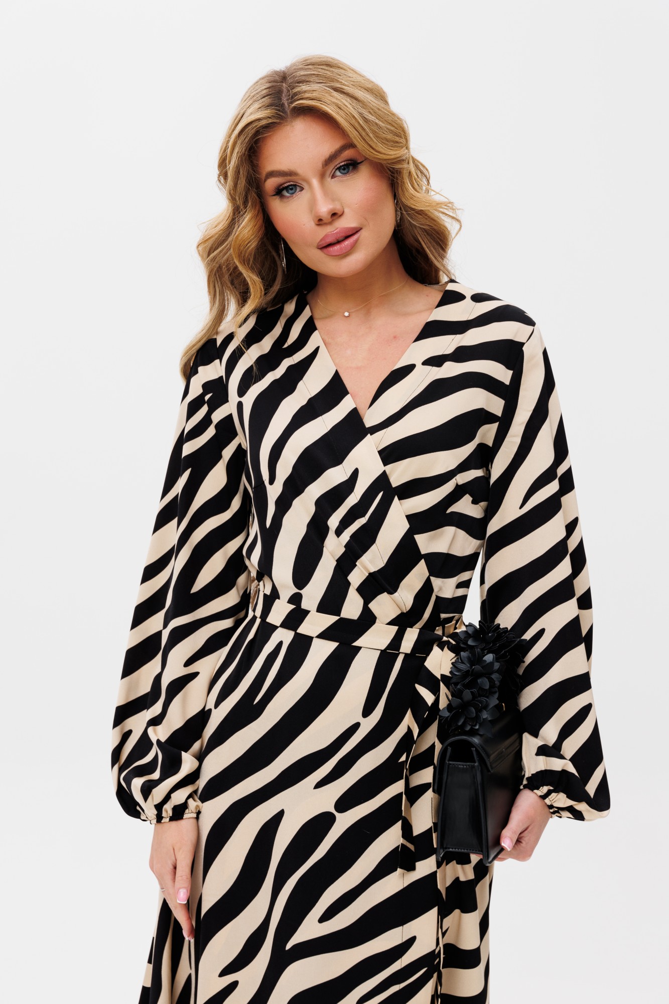 Платье на запах с поясными завязками. Рукав втачной длинный, низ рукава на резинке. В боковых швах юбки действующие карманы.