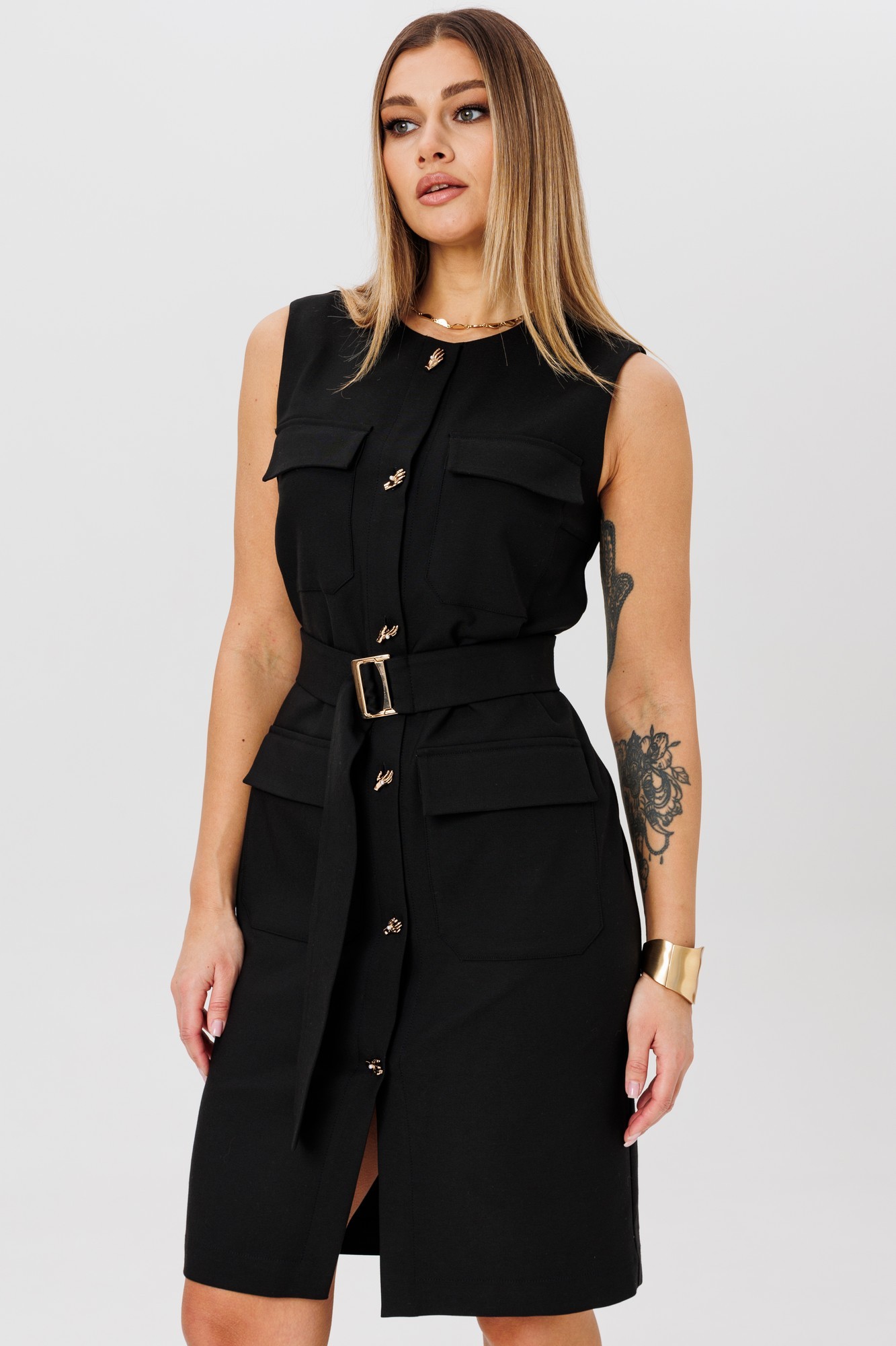 Горловина платья округлой формы, обработана обтачкой. Перед с нагрудными вытачками и карманами с клапаном. Застежка центральная на петли и пуговицы. Пройма обработана обтачкой. Спинка со средним швом и талиевыми вытачками.