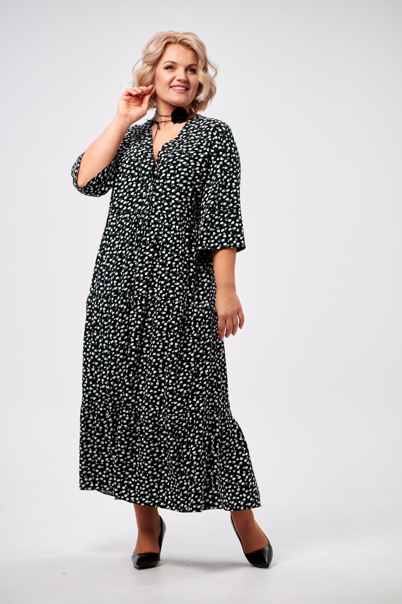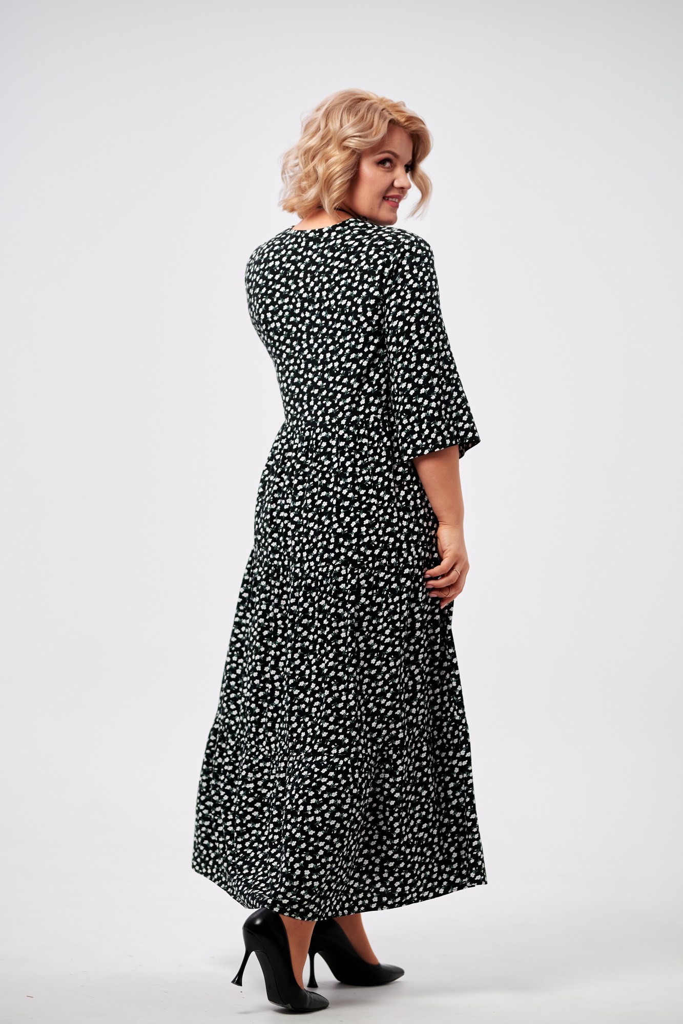 Стильное женское платье из легкой и приятной к телу ткани длиной maxi, которое будет не заменимо как в жаркую погоду, так и в прохладный летний вечер. Платье отрезное по линии талии с тремя воланами на сборку. Лиф полочки с центральной застежкой на приточных планках, застегивающихся на петли и пуговицы. По горловине полочки стойка, по спинке обтачка. В боковых швах волана обработан карман. Рукав втачной, слегка расклешённый к низу, длинной 3/4, по низу обработан притачной манжетой.