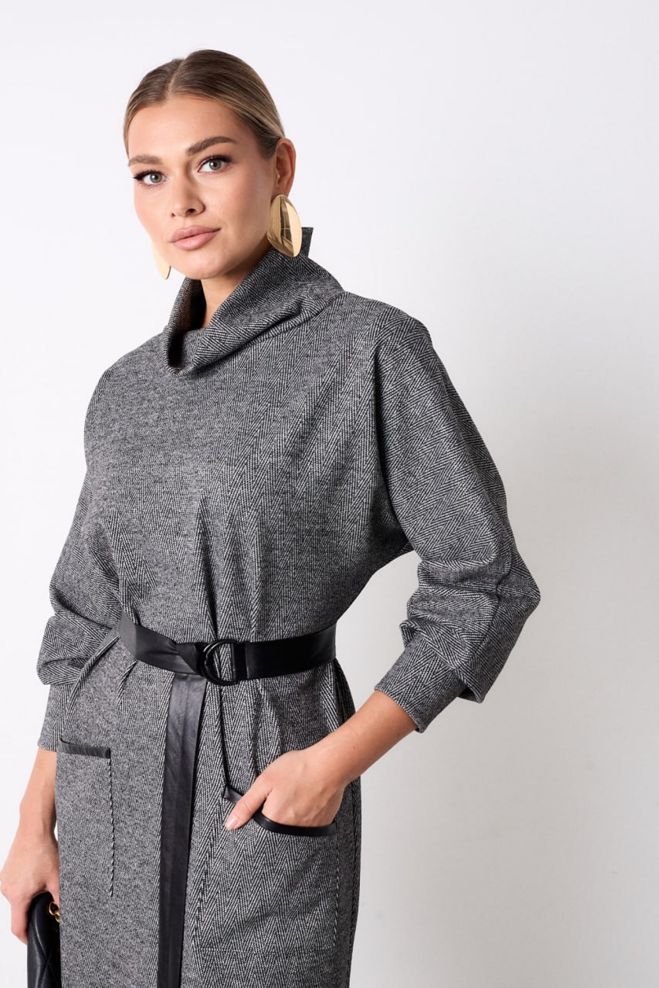 Платье полуприлегающего силуэта из мягкого уютного трикотажа длинной чуть ниже колена. По полочке в области бёдер настрочены накладные карманы с отделкой из кожи. По горловине обработан воротник-хомут. Рукав длинный цельнокроеный, по низу притачная манжета. Платье дополнено съемным поясом из кожи фиксирующимся на пряжку протяжку.