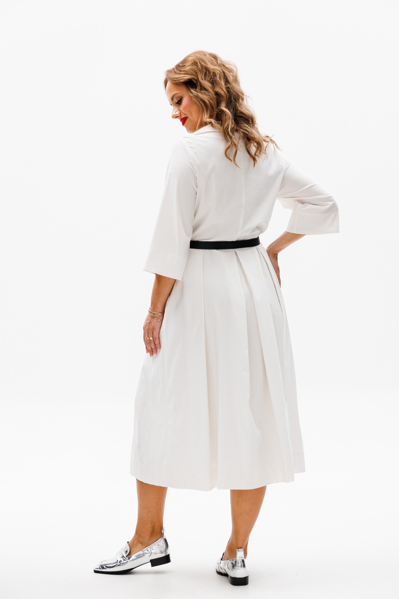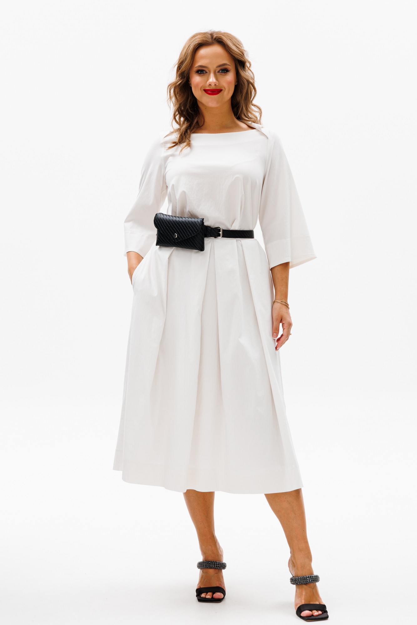 Элегантное женское платье из текстильной ткани. Отрезное по линии талии. По полочке объем груди создается за счет направленных складок из подреза. Объем юбки создается за счет центральной встречной и 2-х односторонних складок. По бокам в юбке- карманы. Юбка на подкладке. Рукав втачной, 3/4 длинны с отворотом. Вырез горловины лодочка с отложным воротником. В качестве декора - поясная сумочка и брошь.