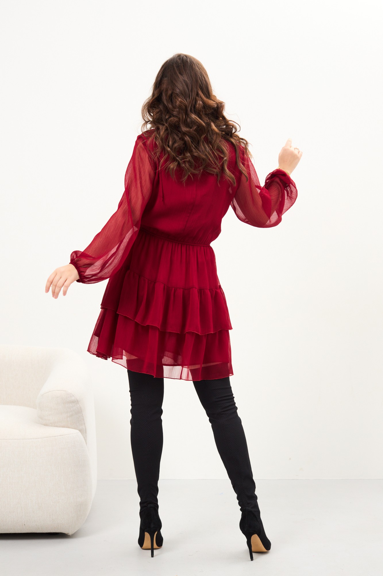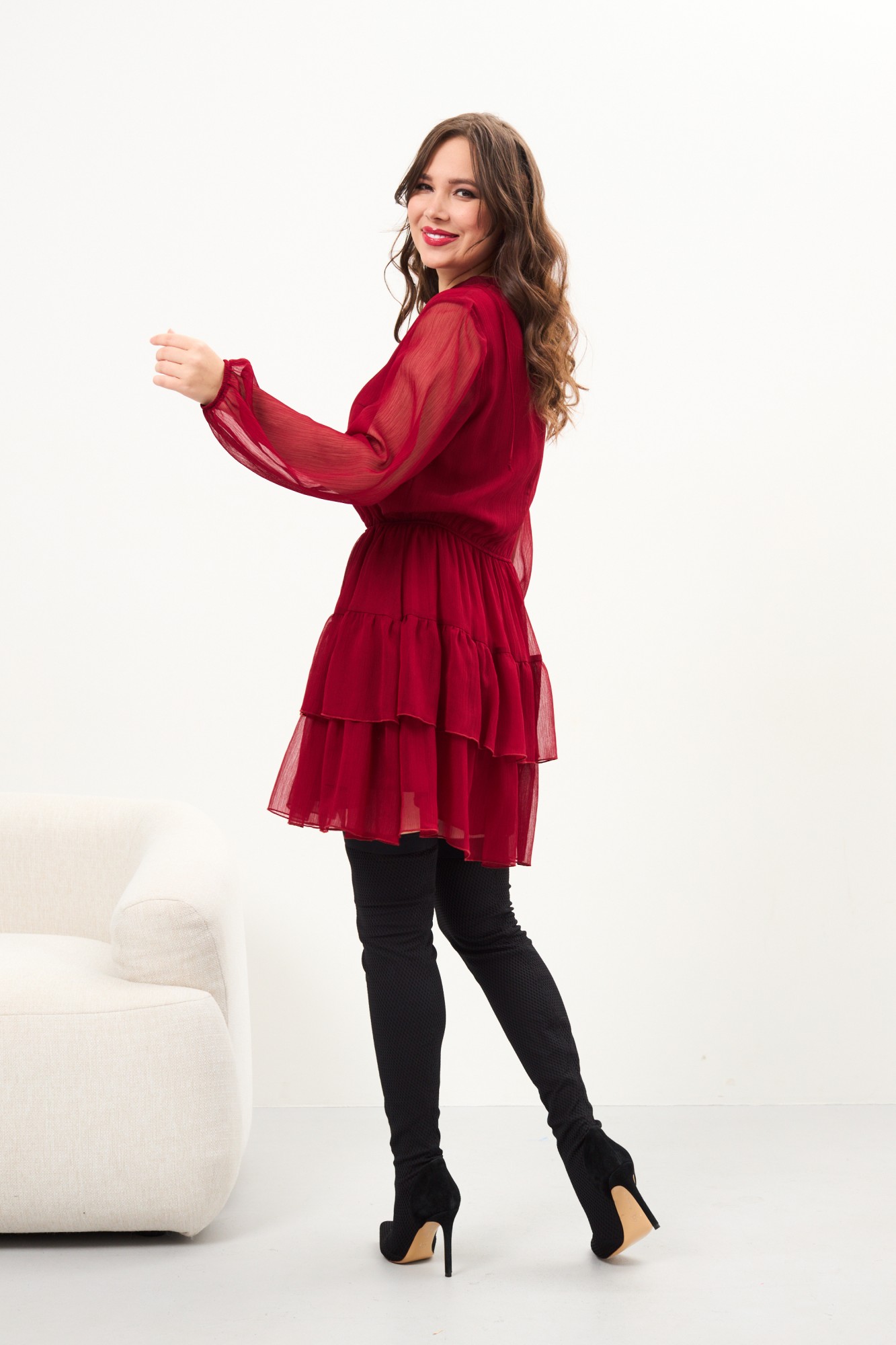 Платье женское из шифоновой ткани на подкладке, отрезное по линии талии , на резинке. Из бокового шва идут грудовые выточки,спинка со средним швом. Воротник-стойка, с завязкой. Юбка с двумя воланами, рукав вточной, низ на резинке.