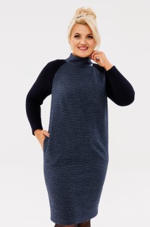Платье женское прямого силуэта из текстильной ткани. Рукав реглан из трикотажного вязанного полотна. По полочке из проймы идут грудовые выточки. По спинке- средний шов, застежка на молнию, по низу разрез. по бокам карманы. Воротник стойка. В качестве декора - по стойке маленькая брендированная металлическая нашивка.