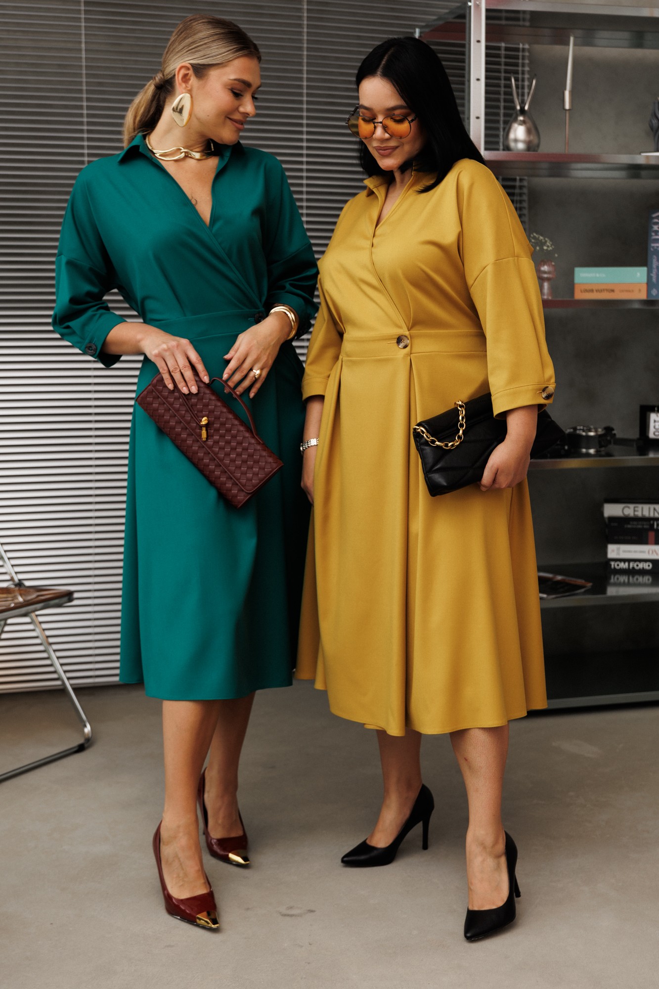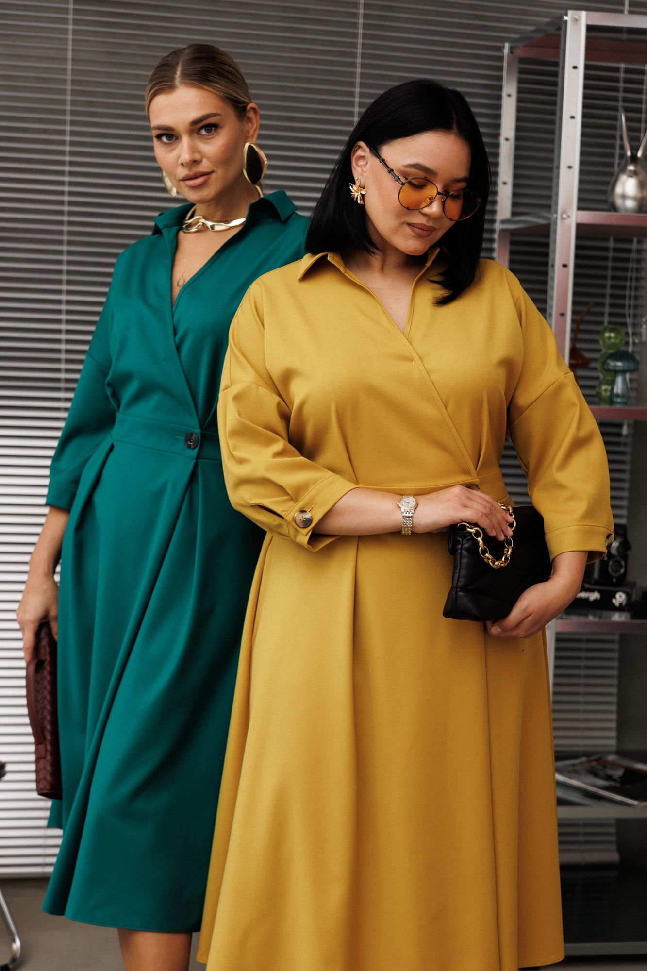 Элегантное женское платье из костюмной ткани необычного кроя станет изюминкой вашего гардероба. Платье полуприлегающего силуэта, отрезное по линии талии со спущенным плечом. Рукав 3/4 длинный на отрезной манжете. По полочке идут защипы-складки в верхней и нижней частях, запах - на петли и пуговицы по подрезу. По нижней части платья запах идет в виде складки. По спинке кокетка со складкой, по подрезу вставлена резинка. Юбка-полусолнце с односторонними складками по полочке, по бокам карманы. По горловине воротник на отрезной стойке. Платье будет идеально смотреться с туфлями, ботинками и сапогами.