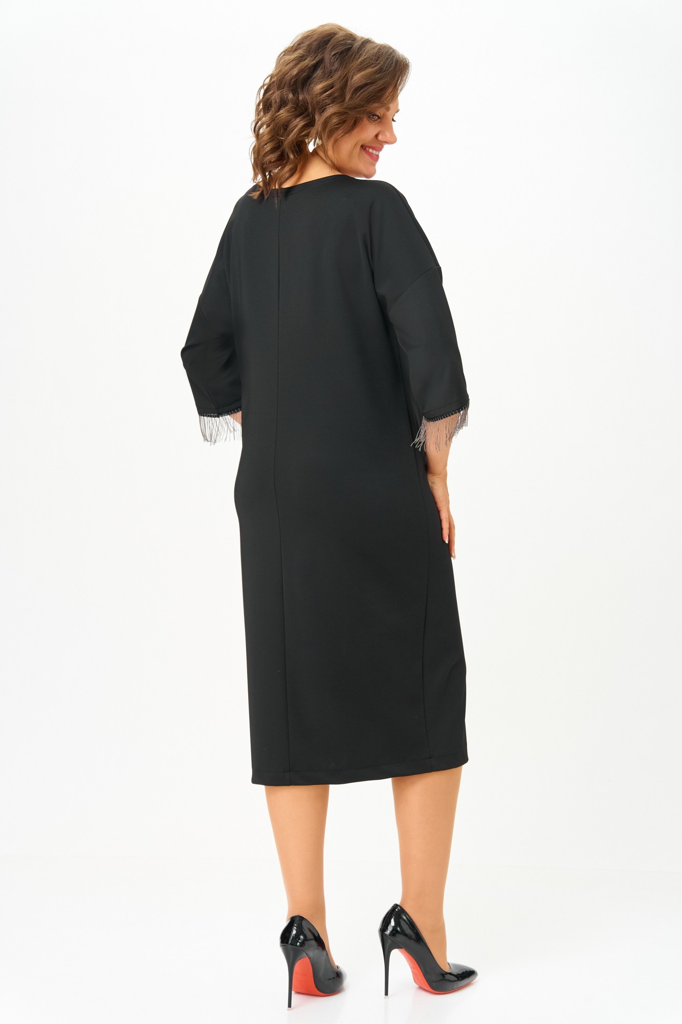 Черное платье миди — не просто одежда, это заявление о вашем стиле и вкусе. Элегантное праздничное платье прямого силуэта из трикотажного полотна. Ткань не мнется. Благодаря своему крою подойдёт для разных типов фигуры. Оно подчеркнёт вашу индивидуальность и станет отличным дополнением к вашему гардеробу. В нём вы будете чувствовать себя уверенно и комфортно, зная, что выглядите на все сто. Выбирая его, вы выбираете качество, комфорт и стиль. Классическое черное платье прямого силуэта, со спущенным плечом. По переду идет подрез с разрезом. В качестве декора по подрезу и низу рукава- металлизированная бахрома. По спинке идет средний шов. Такое платье незаменимая вещь в любом гардеробе. Рекомендуется носить на черное белье.
