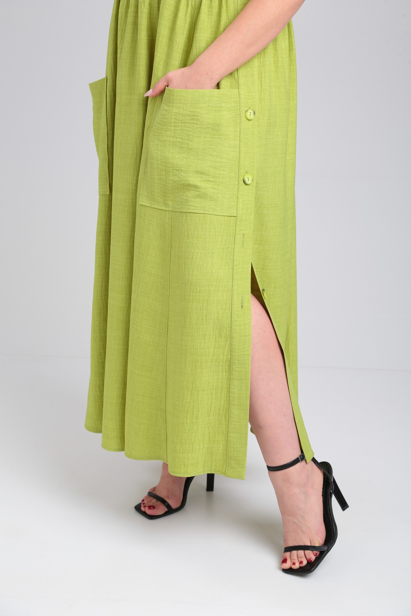 Платье свободного силуэта, длиной макси. Платье выполнено из однотонной ткани с легким эффектом “крэш”. Лиф платья отрезной по линии талии. Полочка лифа с нагрудными вытачками и средним швом в верхней части которого обработан разрез. Спинка лифа цельная с талиевыми вытачками. Горловина круглой формы. Пройма углубленной формы. Рукав одношовный, длиной до локтя. Юбка со сборкой по шву притачивания к лифу. По боковым швам обработаны притачные планки с застежкой на петли и пуговицы. На передней части юбки обработаны накладные карманы.