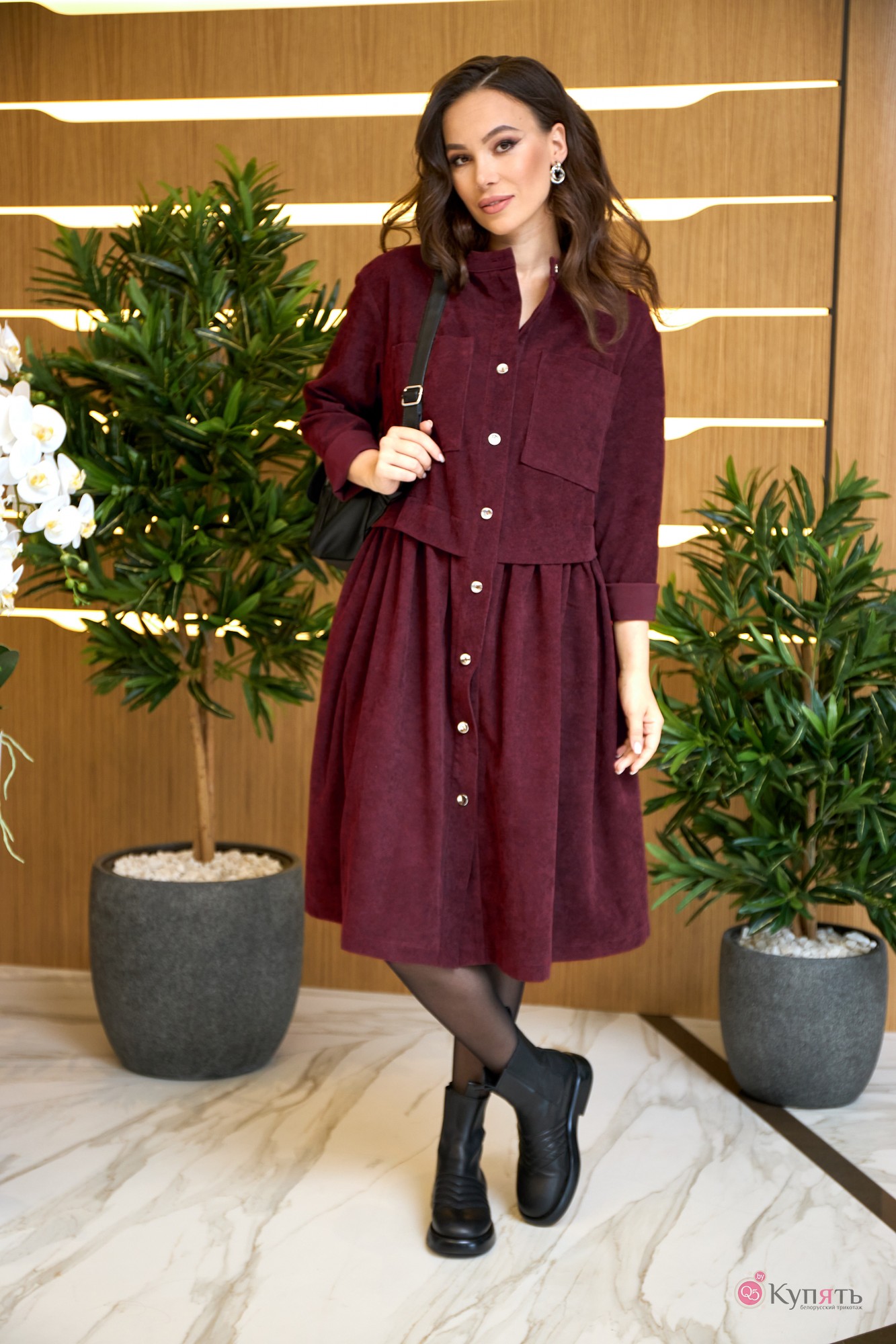 Платье прямого силуэта, длиной за колено, выполнено из вельвета в мелкий рубчик. Полочка платья с отрезной планкой по центру и застежкой на петли и пуговицы. Лиф платья отрезной, со складкой по низу, к срезу которой притачана юбка со сборкой. Полочка лифа с нагрудными вытачками и накладными карманами. Горловина круглой формы обработана воротником-стойкой. Пройма углубленной формы с рукавом рубашечного типа, рукав длинный, одношовный. В боковых швах юбки обработаны карманы.