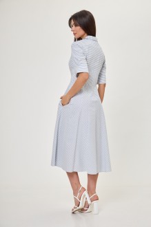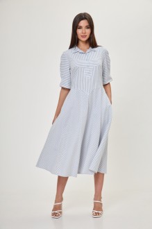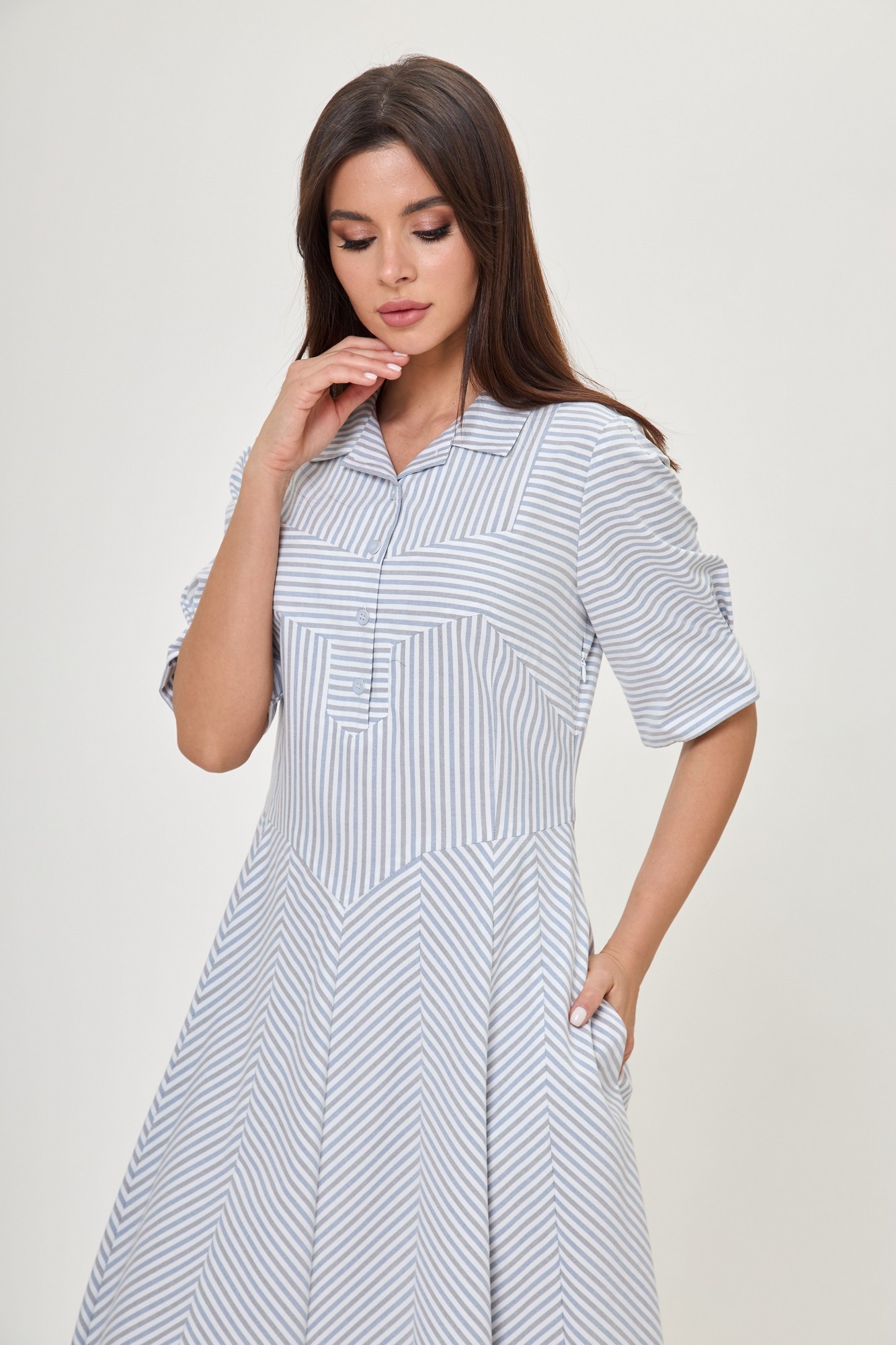 Платье заужено по талии, юбка силуэтом полусолнце, застежка на петли пуговицы до линий талии. Рукав короткий, на манжете. Горловина обработана воротником. Платье уникально и свежо смотрится, благодаря игре деталей и полоски. А как известно всем модницам, полоска актуальна всегда, вне зависимости от сезона.