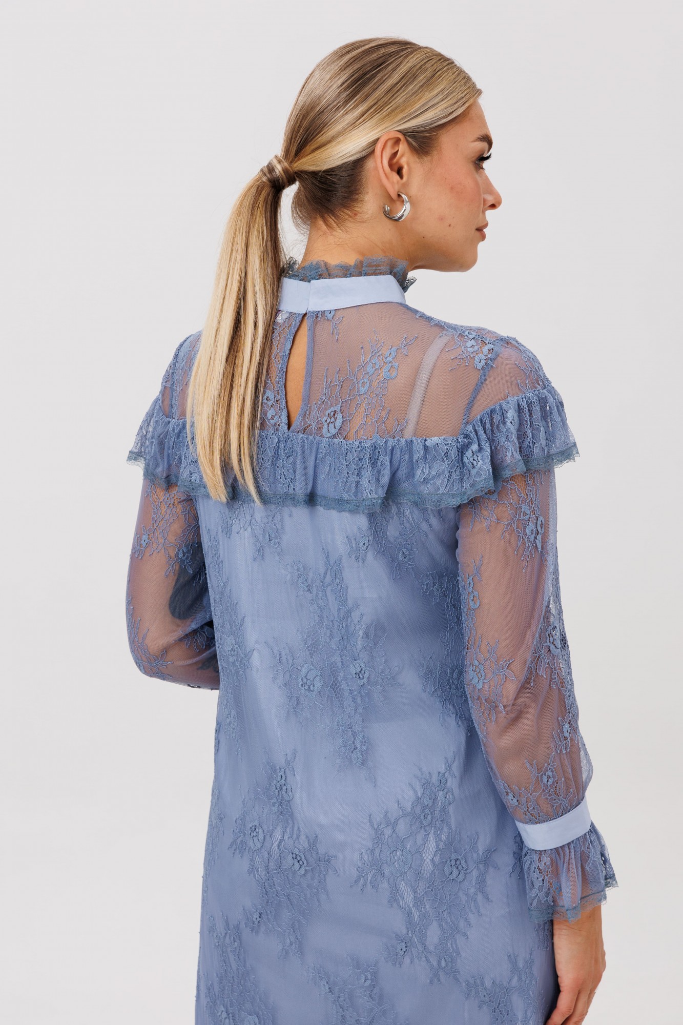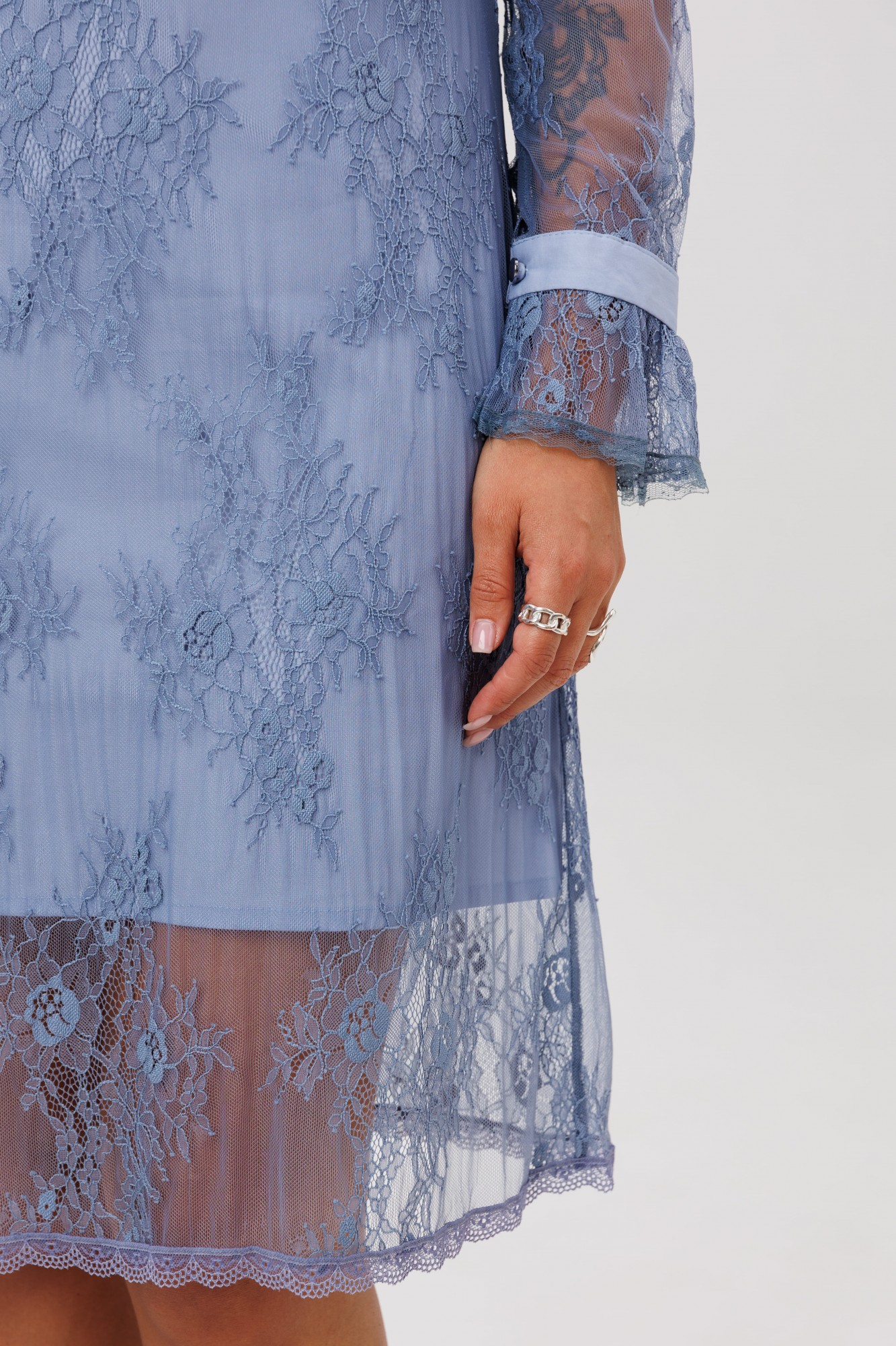 Каждый элемент продолжает повествование о романтике: втачные рукава, строгие и утонченные у манжет с изящной пуговицей, неожиданно раскрываются нежным кружевным веером-валоном у запястья. Высокая стойка воротника, обрамленная ажурной тесьмой, придает благородную четкость линиям шеи, а тайна скрыта за спиной — где ряд пуговиц, словно жемчужины, хранит ключ к этому прекрасному наряду.