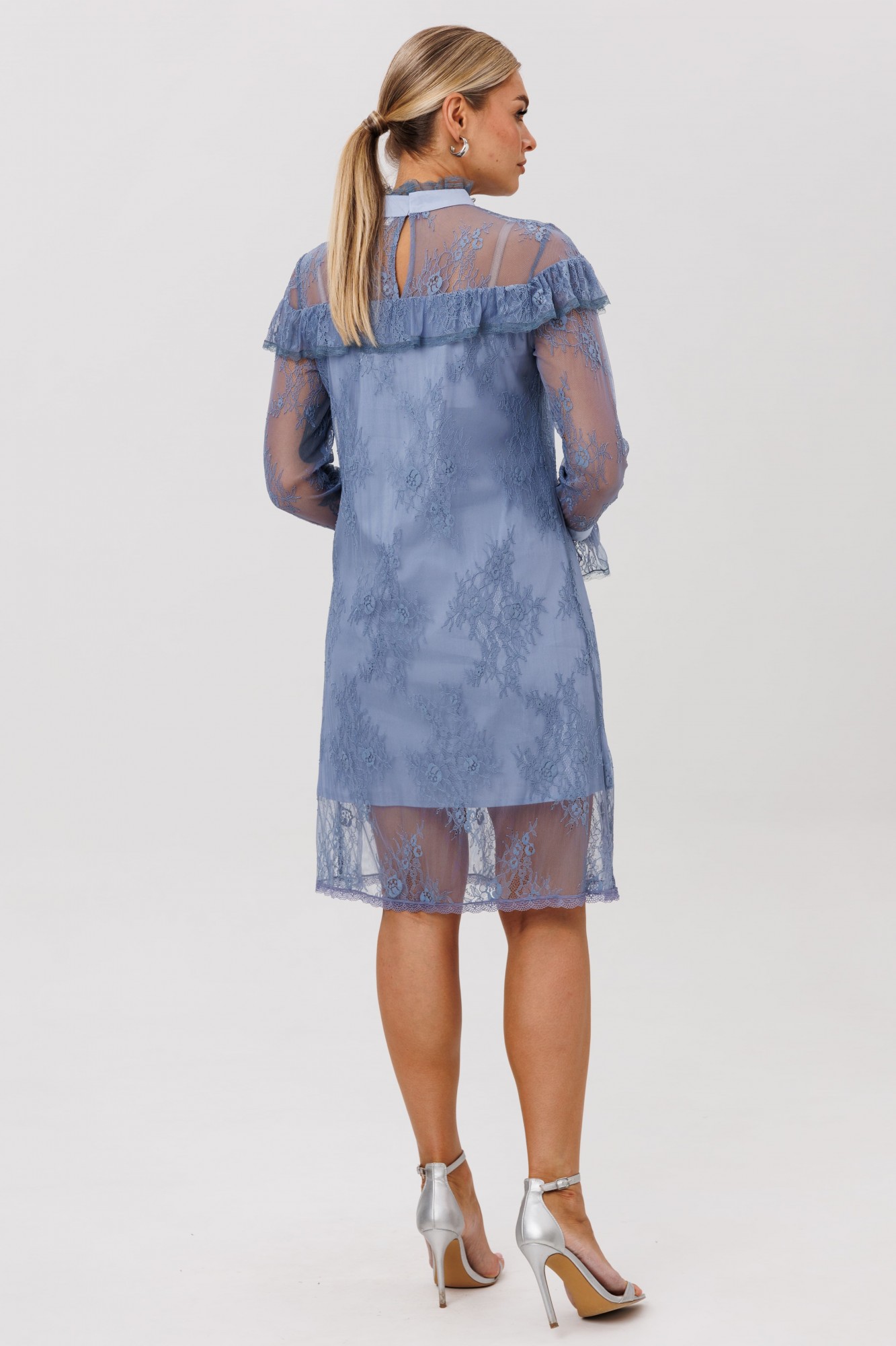 Это платье, сотканное из воздуха и тончайших нитей. Нежное кружевное полотно, подобно легкой дымке, обволакивает силуэт, заключая его в элегантные и строгие линии прямого кроя. Изысканность кроется в деталях: кокетки, украшающие лиф спереди и сзади, мягко ниспадают изящными волнами, подчеркивая линию плеч и даря образу трогательную, почти что хрупкую грацию.