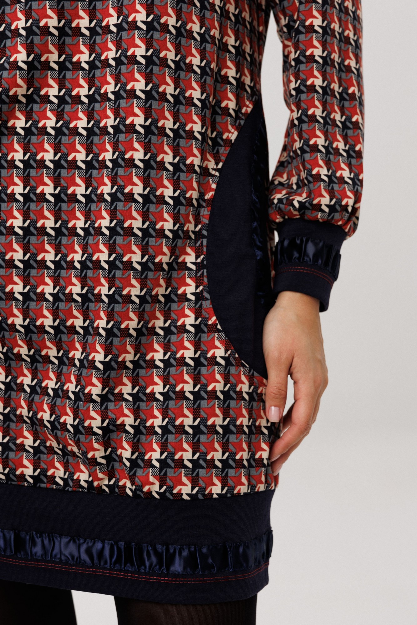 Его прилегающий силуэт, рожденный из струящегося трикотажа, мягко следует за изгибами фигуры, создавая ощущение утонченной элегантности. Классическая строгость круглого выреза горловины и длинных втачных рукавов, завершенных изящными манжетами, служит идеальным фоном для трогательного акцента — нежной завязки-капельки, украшенной переливом атласной ленты. Эту лиричную ноту мастерски уравновешивают практичные элементы: два аккуратных накладных кармана и четкий манжет по низу, которые придают силуэту завершенность и структуру.