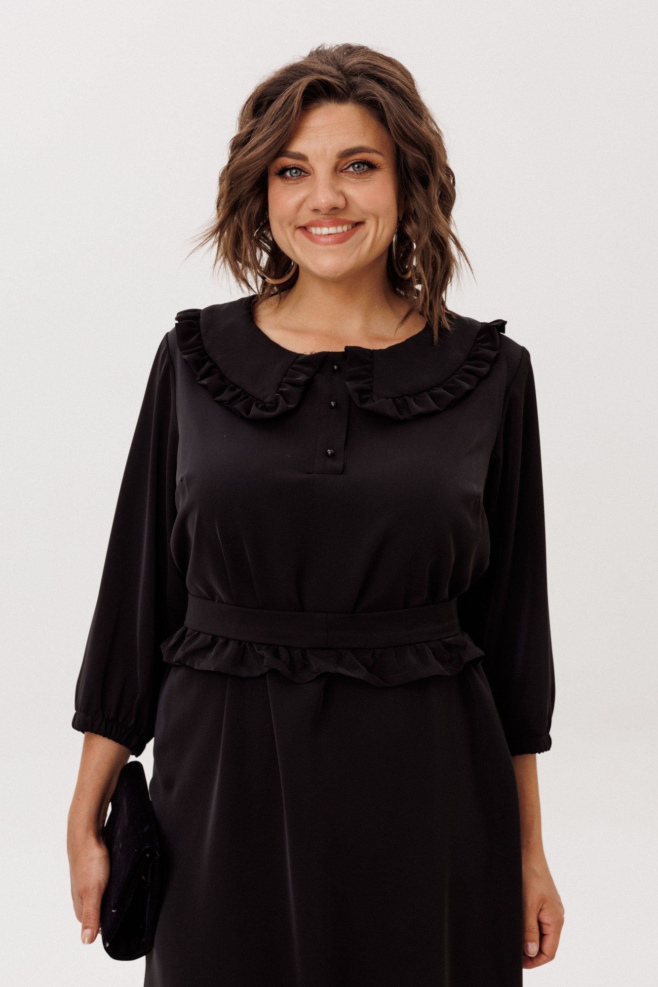 Круглый вырез горловины обработан отложным воротником с рюшем, придающим платью шарм и изысканность.