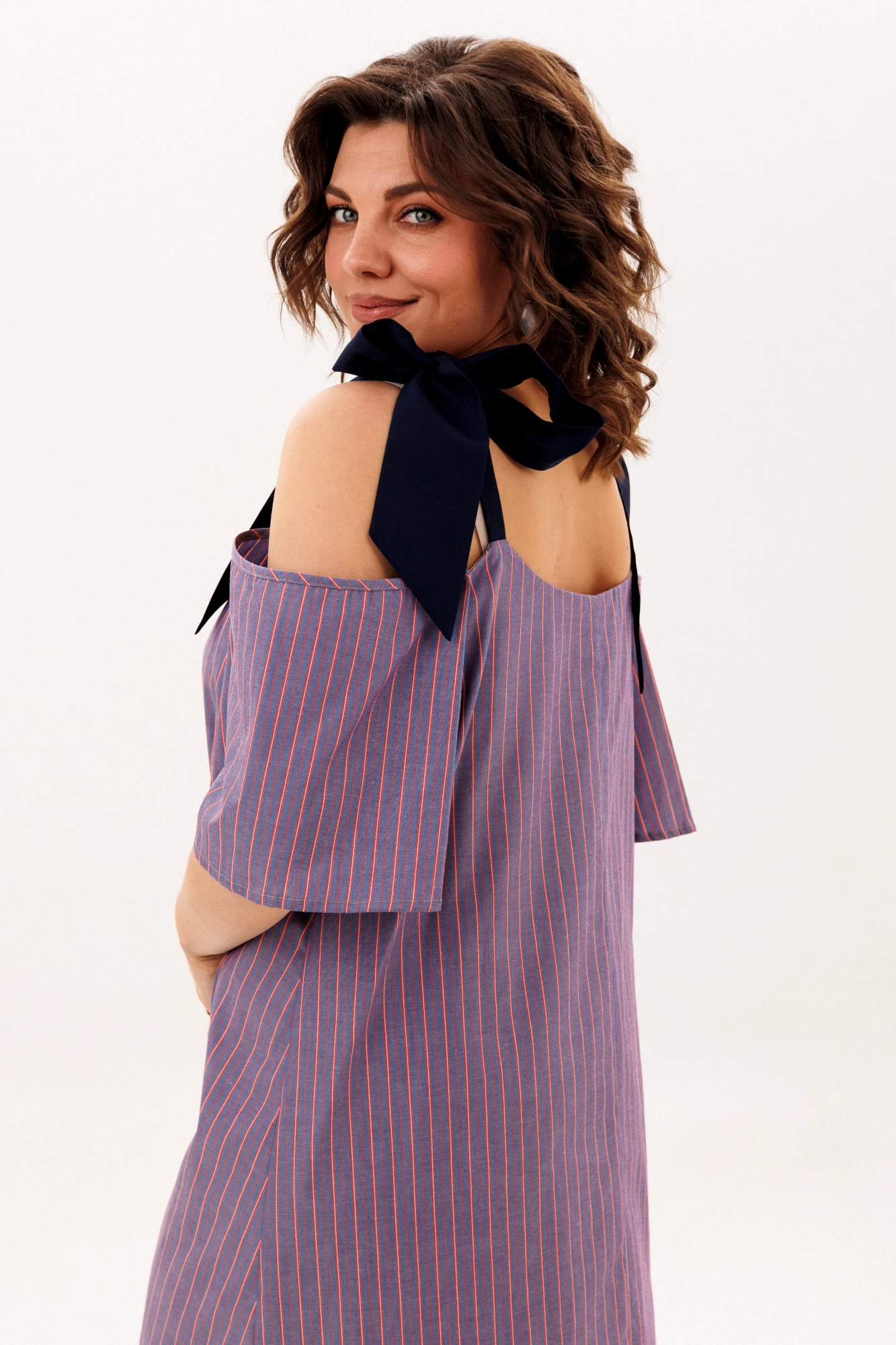Свободный силуэт мягко струится по фигуре, расширенные рукава красиво падают, добавляя образу расслабленную элегантность, а продуманная длина дарит ощущение уверенности и свободы - и в будничной суете, и в тёплых днях отдыха. Особое настроение создают широкие бретели, которые можно завязать в кокетливый бант, добавляя образу игривости и нежности.