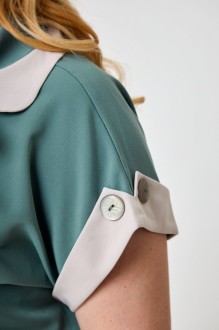 Платье женское, полуприлегающего силуэта, длиной до колена. Спущенный короткий рукав с фигурным манжетом. По переду на груди защипы и вертикальные рельефы с прорезными карманами на уровне бедра. Спинка со средним швом и талиевыми вытачками. Горловина обработана фигурным воротником. Платье декорированно контрастными элементами воротника, манжетами, листочками и по низу платья декоративной вставкой. Интересный дизайн, свободный силуэт, актуальная цветовая гамма придадут вашему образу новизны и при этом в платье вам будет очень комфортно. Вся необходимая информация о производителе указана на этикетке.