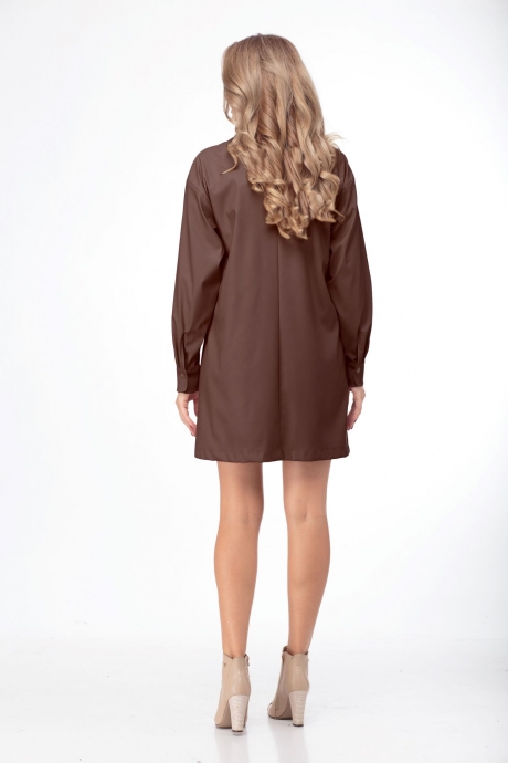 Платье-рубашка из эко-кожи свободного покроя с накладными карманами-книга и клапаном. Спущенная линия плеча, втачной одношовный рукав на манжете. Застежка на пуговицы по притачной планке. Отложной воротник на стойке.