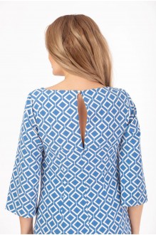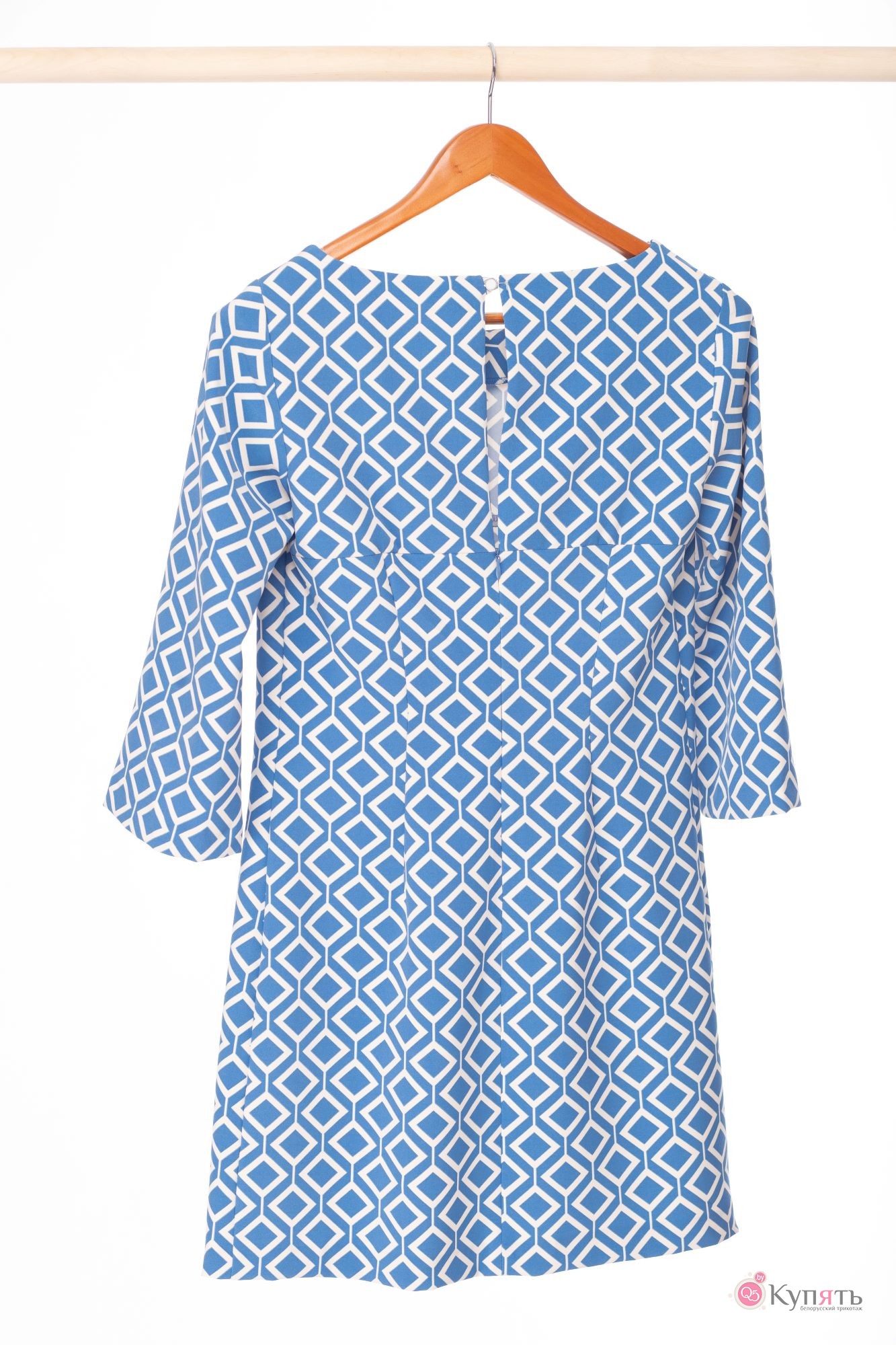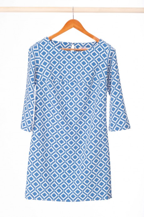 Платье длиной выше колена, с геометрическим принтом, молочного и голубого оттенков с принтом «девочка с зонтиком». А-образного силуэта.