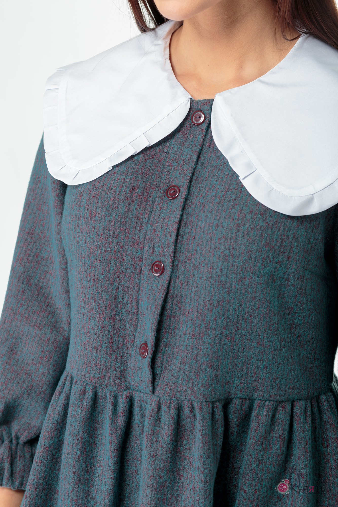 Особенностью этого очаровательного платья является съёмный белый воротник с рюшей по отлёту.