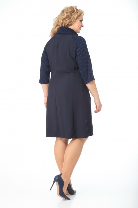 Платье полуприлегающего силуэта, средней длины благородного синего оттенка.