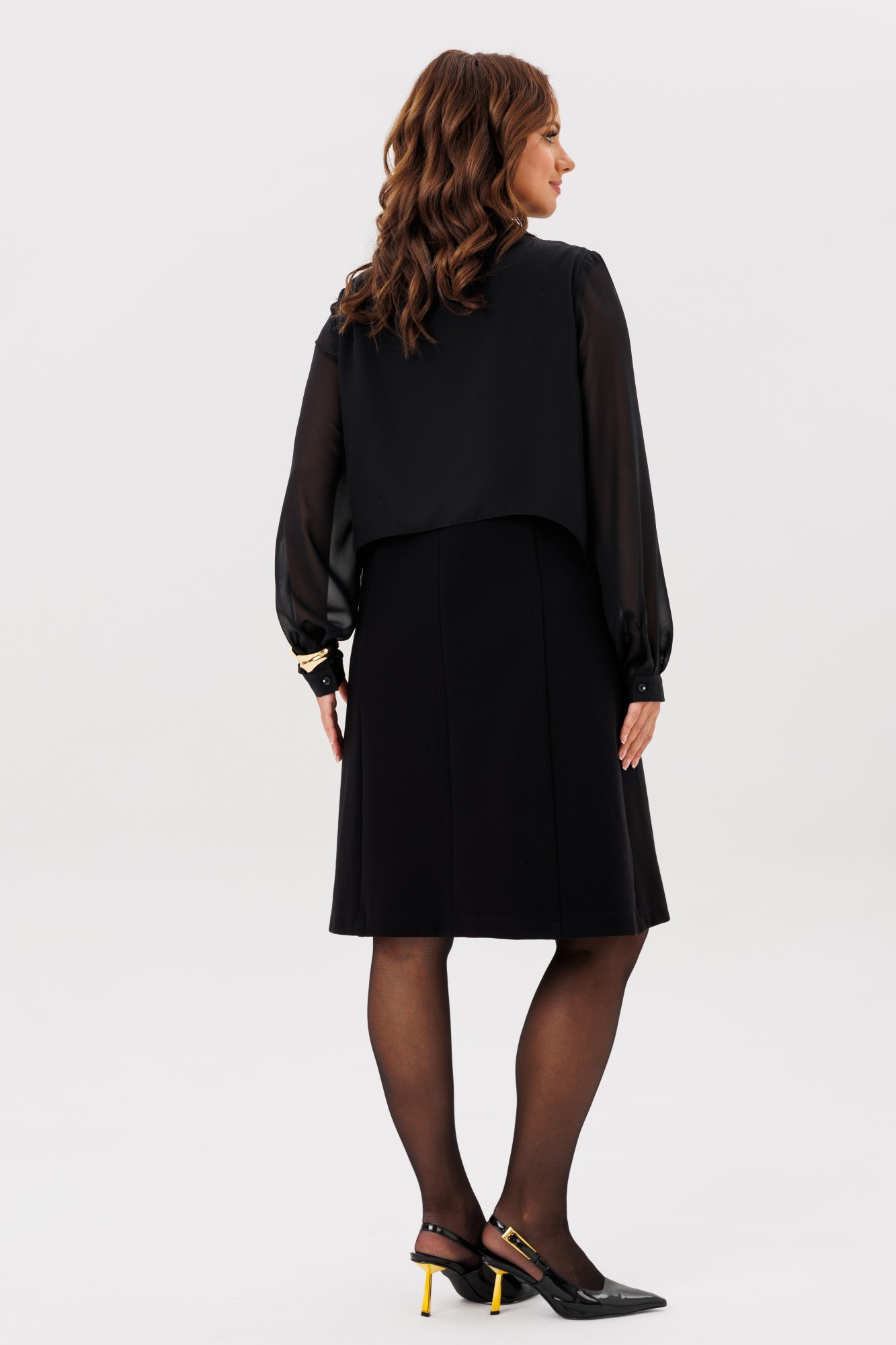 Платье трикотажное прямого силуэта умеренного объема. Вырез горловины V-образный, имитация рубашки из шифона, рукав рубашечного покроя - 63 см.