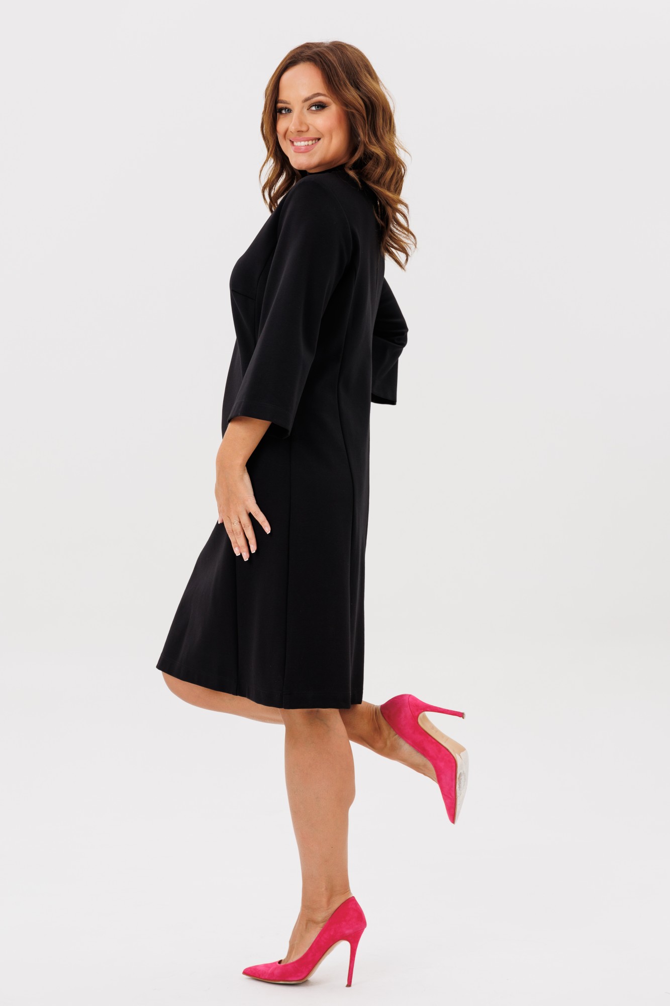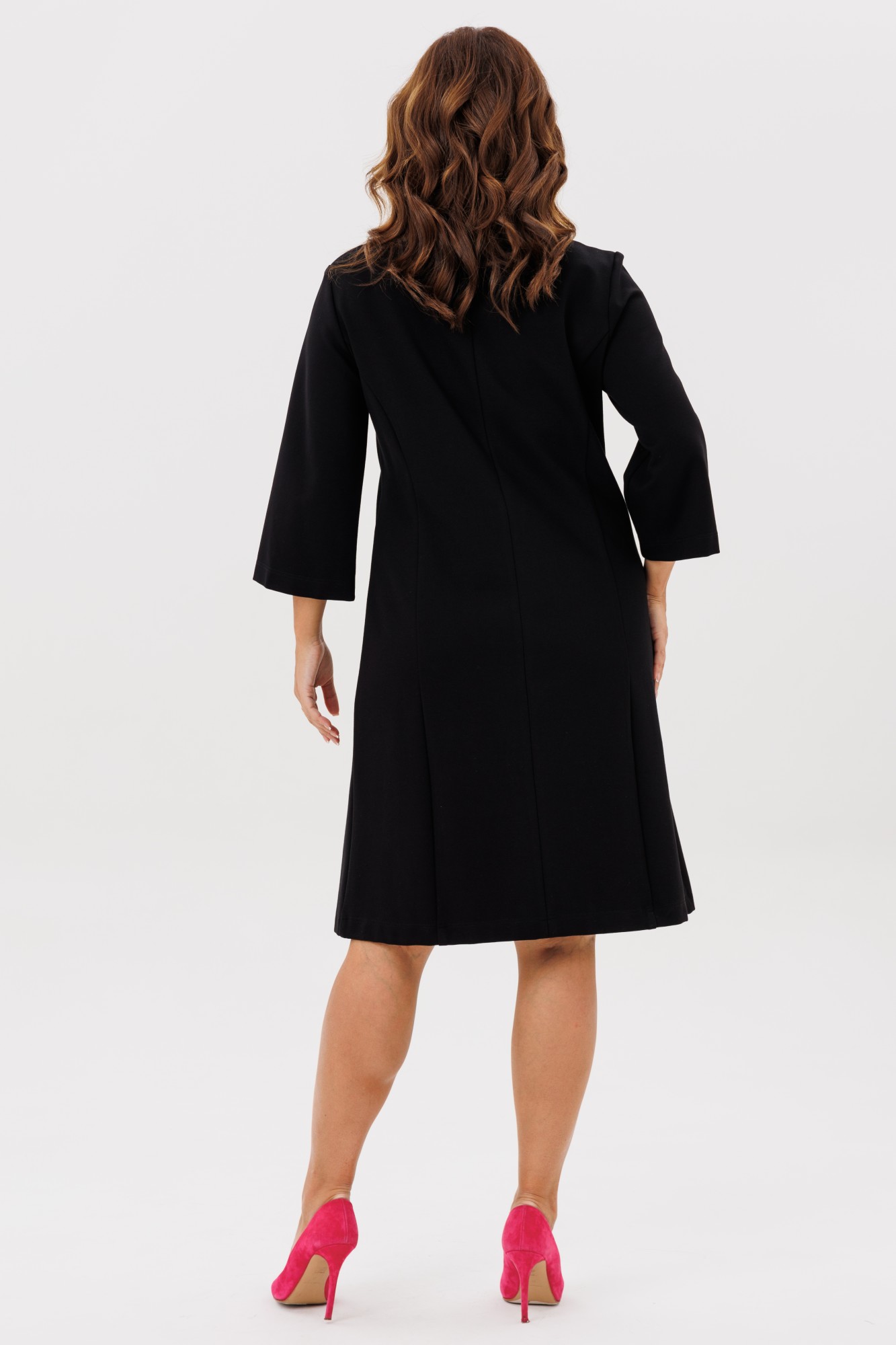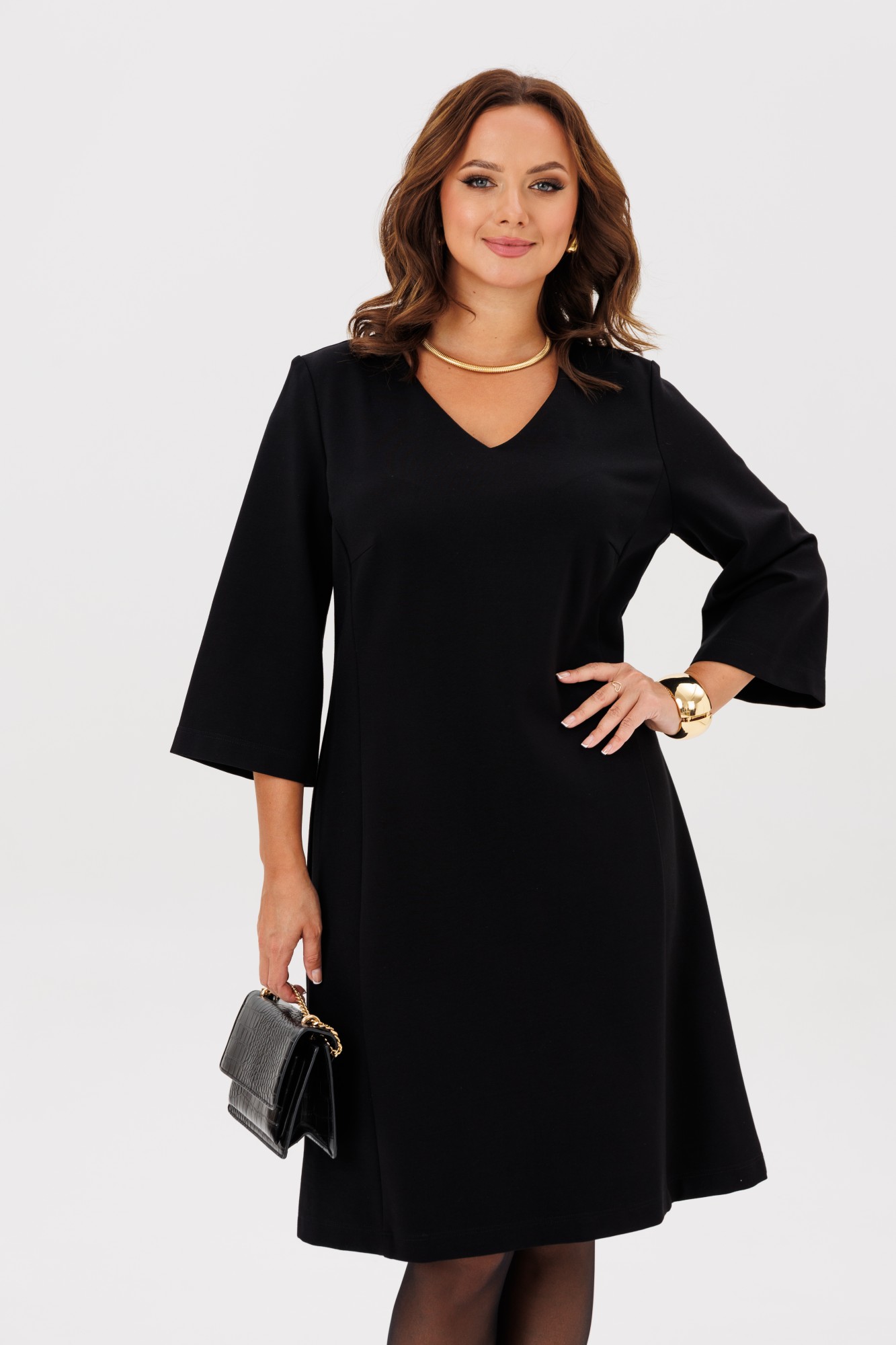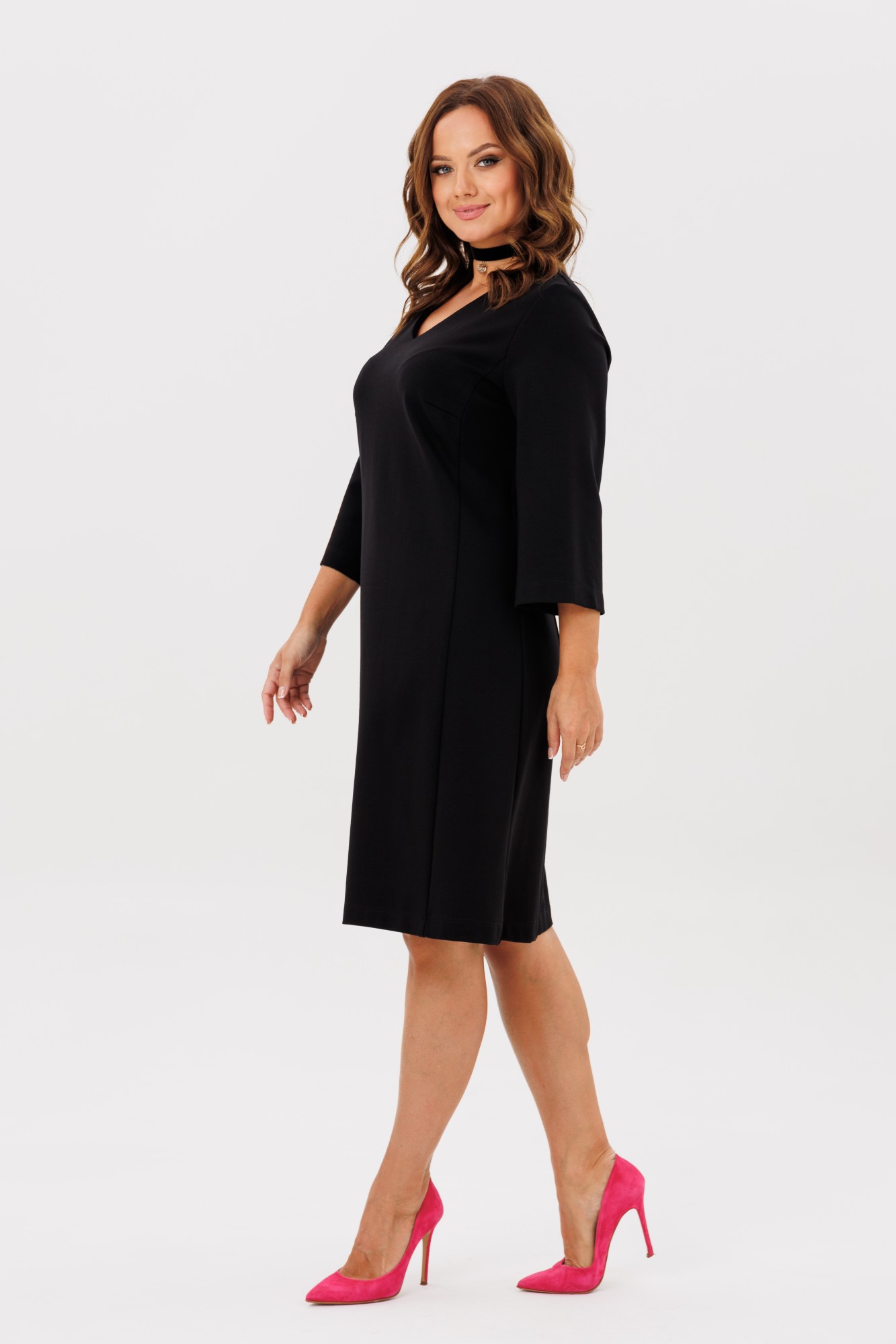 Платье на каждый день, трикотажное прямого силуэта умеренного объема. Вырез горловины V-образный, рукав 3/4 рубашечного покроя - 47см.