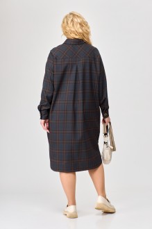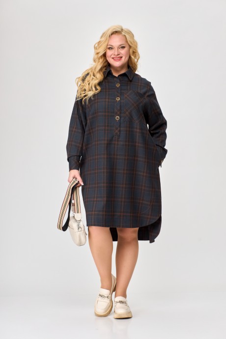Платье прямого силуэта. По центру переда в верхней части обработана планка, которая застегивается на 3 петли и пуговицы, на левой части переда большой накладной карман. В верхней части спинки кокетка, от кокетки идет встречная складка, отсточеная отделочной строчкой. Плечо спущенное, рукав длинный, заканчивается манжетой, которая застегивается на 1 петлю и пуговицу .Низ платья закругляется к бокам по переду и спинке, спинка длиннее, чем перед. Низ обработан обтачкой и отстрочен широкой отделочной строчкой. В боковых швах есть карманы. .