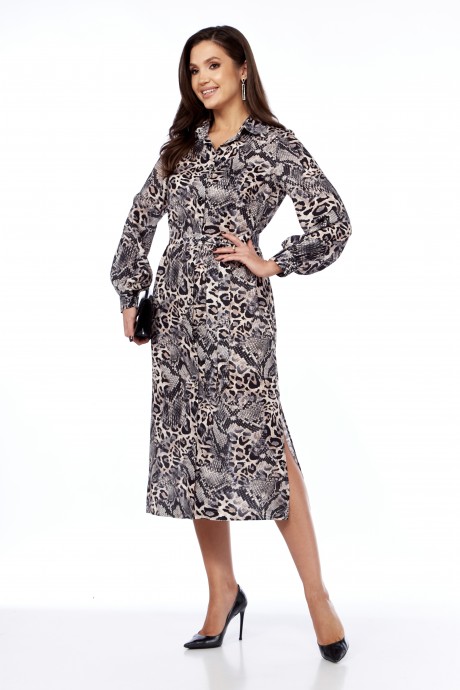 Женское платье -рубашка, выполнено из креповой плательно-блузочной ткани с оригинальным модным дизайном. Платье с центральной застёжкой на петли и пуговицы. Перед с нагрудными вытачками из пройм. Спинка цельная. По бокам разрезы. Горловина обработана отложным воротником со стойкой. Рукава втачные одношовные длинные, низ присборен и обработан притачными манжетами с застёжкой на петлю и пуговицу. Платье укомплектовано поясом -завязкой из основной ткани.