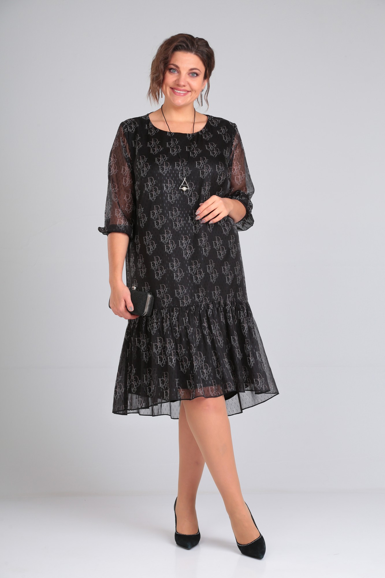 Платье силуэта трапеция с втачным рукавом длиной 3/4, выполнено из тончайшего шифона с дизайном.По переду нагрудные вытачки.Спинка удлинённая, со средним швом и застёжкой на потайную молнию.По низу платья волан .Низ рукава на резинке.Платье на атласной подкладке.