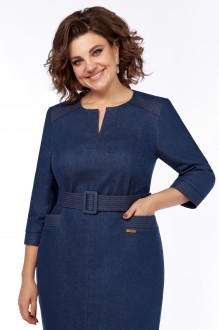 Платье женское полуприлегающего силуэта выполнено из джинсовой ткани. Перед со средним швом, заканчивающимся разрезом, кокетками и рельефами от них до бокового шва, в шве выполнены карманы с листочкой. Круглый вырез горловины с планками по переду. Спинка со средним швом и талиевыми вытачками. Рукава втачные двухшовные длинной 3/4,низ на притачных манжетах. Платье укомплектовано поясом , выполненным из основной ткани .Пояс, кокетки, планки, листочки и манжеты отсрочены декоративными контрастными строчками.